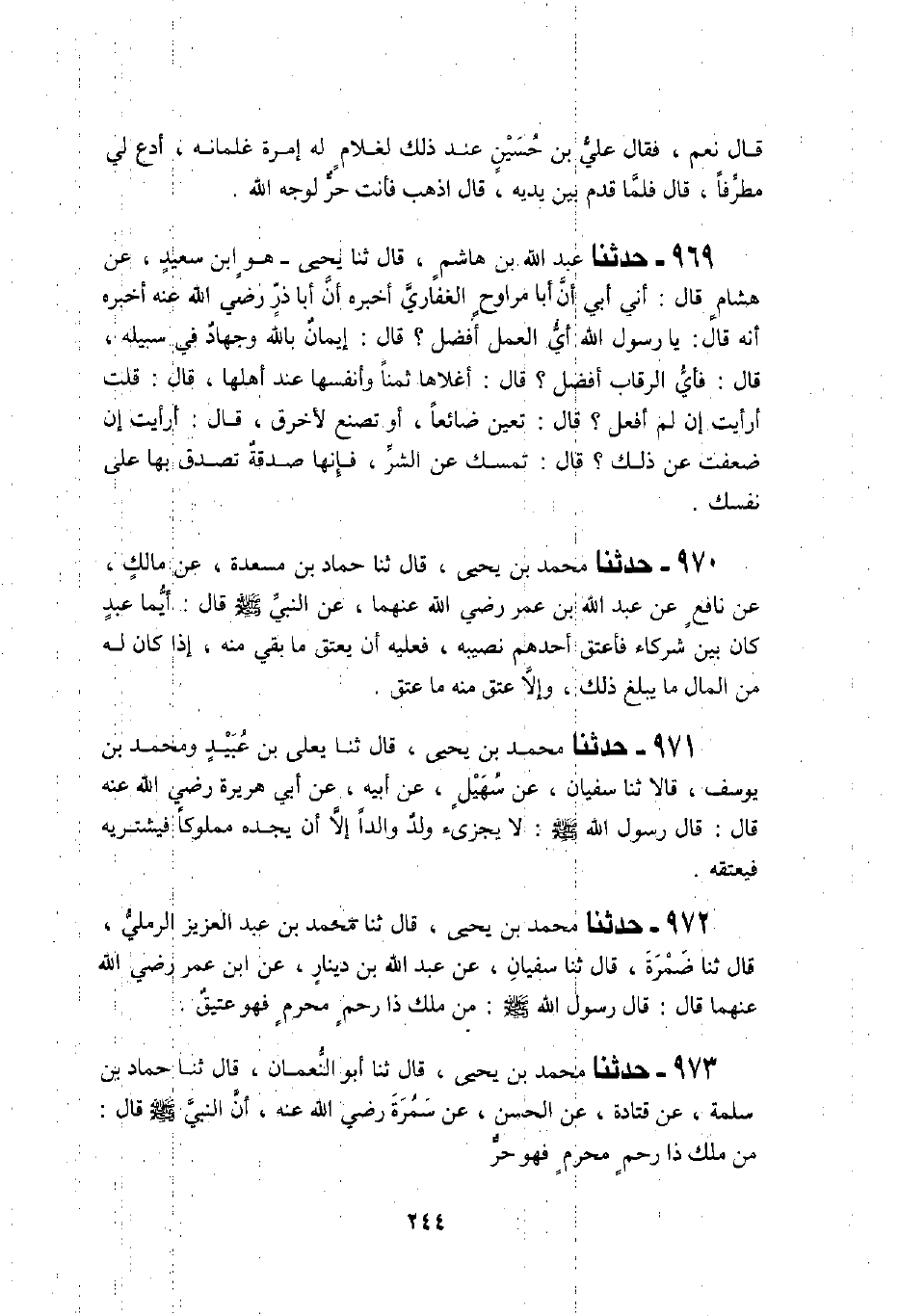 969 - حَدَّثَنَا عَبْدُ اللَّهِ بْنُ هَاشِمٍ، قَالَ: ثنا يَحْيَى هُوَ ابْنُ سَعِيدٍ، عَنْ هِشَامٍ، قَالَ: أَنِي أَبِي، أَنَّ أَبَا مُرَاوِحٍ الْغِفَارِيَّ، أَخْبَرَهُ، أَنَّ أَبَا ذَرٍّ رَضِيَ اللَّهُ عَنْهُ أَخْبَرَهُ أَنَّهُ، قَالَ: يَا رَسُولَ اللَّهِ §أَيُّ الْعَمَلِ أَفْضَلُ؟ قَالَ: «إِيمَانٌ بِاللَّهِ وَجِهَادٌ فِي سَبِيلِهِ» ، قَالَ: فَأَيُّ الرِّقَابِ أَفْضَلُ قَالَ: «أَغْلَاهَا ثَمَنًا وَأَنْفَسُهَا عِنْدَ أَهْلِهَا» ، قَالَ: قُلْتُ: أَرَأَيْتَ إِنْ لَمْ أَفْعَلْ؟ قَالَ: «تُعِينُ ضَائِعًا أَوْ تَصْنَعُ لِأَخْرَقَ» ، قَالَ: أَرَأَيْتَ إِنْ ضَعُفْتُ عَنْ ذَلِكَ؟ قَالَ: «تُمْسِكُ عَنِ الشَّرِّ فَإِنَّهَا صَدَقَةٌ تَصَدَّقُ بِهَا عَلَى نَفْسِكَ»