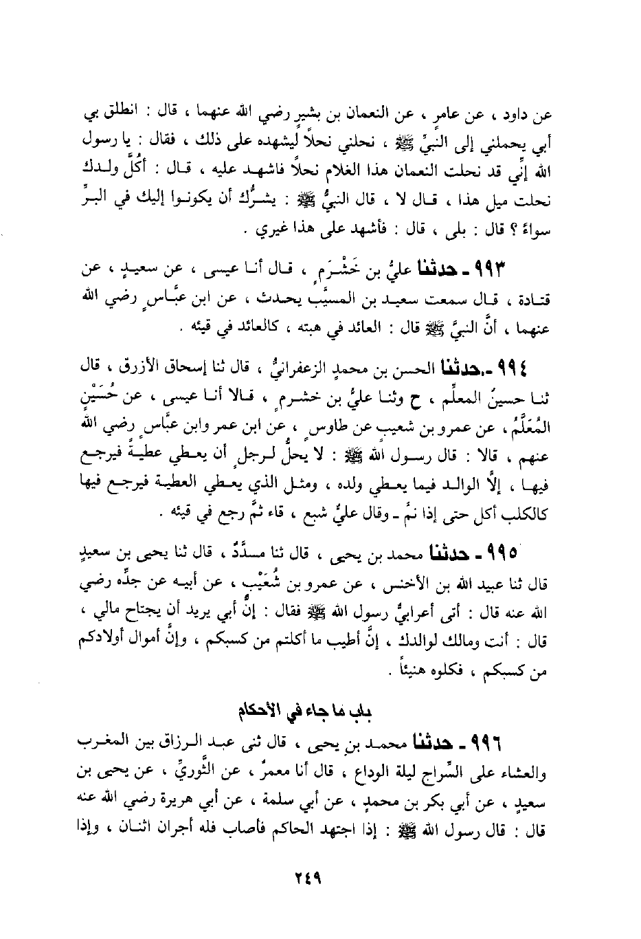993 - حَدَّثَنَا عَلِيُّ بْنُ خَشْرَمٍ، قَالَ: أنا عِيسَى، عَنْ سَعِيدٍ، عَنْ قَتَادَةَ، قَالَ: سَمِعْتُ سَعِيدَ بْنَ الْمُسَيَّبِ يُحَدِّثُ، عَنِ ابْنِ عَبَّاسٍ، رَضِيَ اللَّهُ عَنْهُمَا أَنَّ النَّبِيَّ صَلَّى اللهُ عَلَيْهِ وَسَلَّمَ قَالَ: «§الْعَائِدُ فِي هِبَتِهِ كَالْعَائِدِ فِي قَيْئِهِ»
