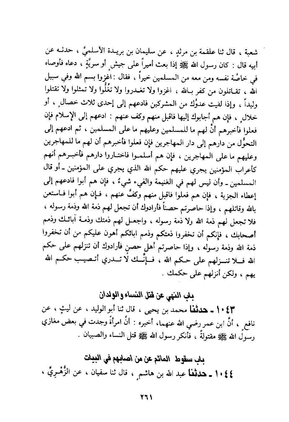 1043 - حَدَّثَنَا مُحَمَّدُ بْنُ يَحْيَى، قَالَ: ثنا أَبُو الْوَلِيدِ، عَنْ لَيْثٍ، عَنْ نَافِعٍ، أَنَّ ابْنَ عُمَرَ، رَضِيَ اللَّهُ عَنْهُمَا أَخْبَرَهُ «أَنَّ امْرَأَةً وُجِدَتْ فِي بَعْضِ مَغَازِي رَسُولِ اللَّهِ صَلَّى اللهُ عَلَيْهِ وَسَلَّمَ مَقْتُولَةً §فَأَنْكَرَ رَسُولُ اللَّهِ صَلَّى اللهُ عَلَيْهِ وَسَلَّمَ قَتْلَ النِّسَاءِ وَالصِّبْيَانِ»