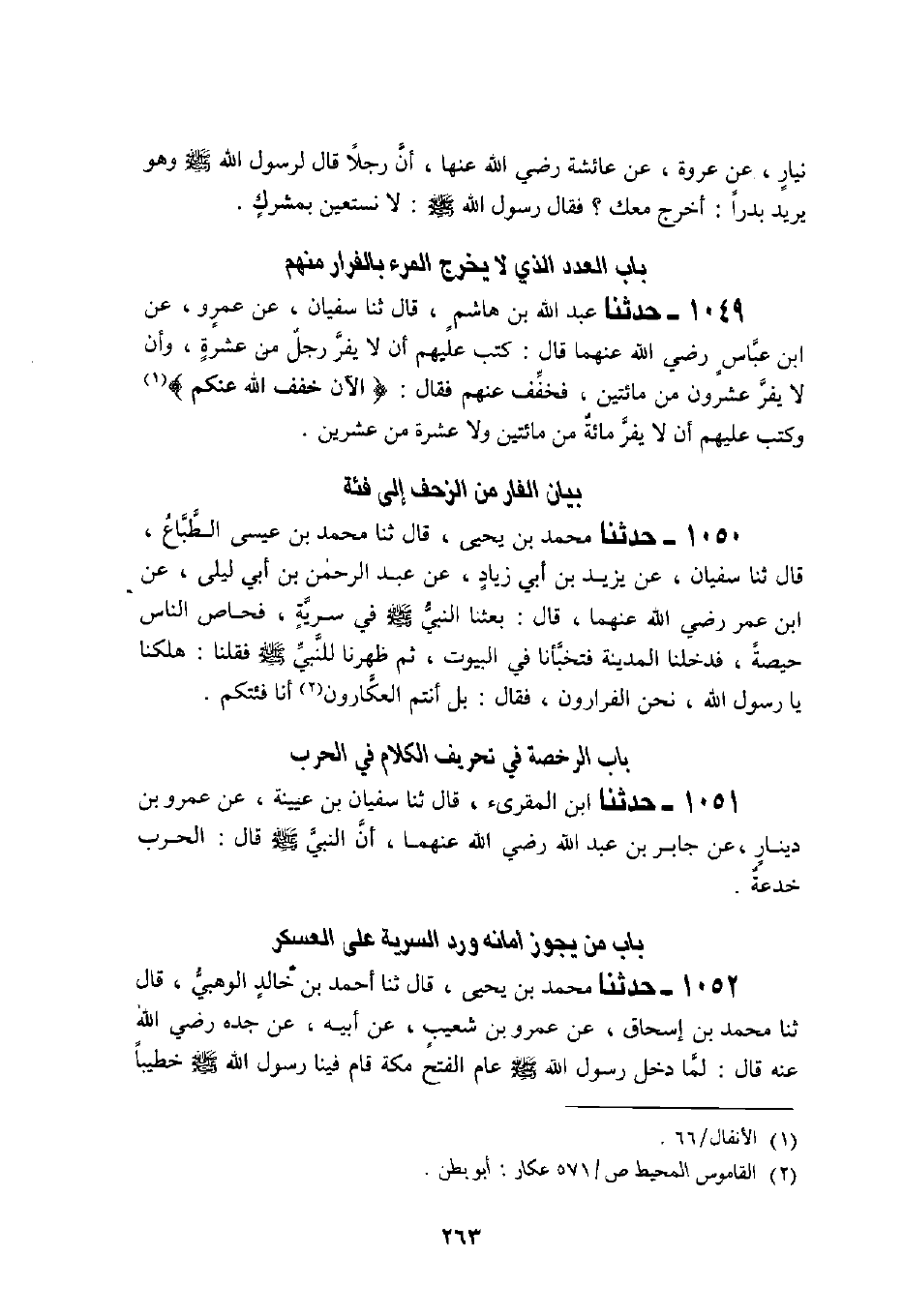 1049 - حَدَّثَنَا عَبْدُ اللَّهِ بْنُ هَاشِمٍ، قَالَ: ثنا سُفْيَانُ، عَنْ عَمْرٍو، عَنِ ابْنِ عَبَّاسٍ، رَضِيَ اللَّهُ عَنْهُمَا قَالَ: كُتِبَ عَلَيْهِمْ أَنْ §لَا يَفِرَّ رَجُلٌ مِنْ عَشَرَةٍ، وَأَنْ لَا يَفِرَّ عِشْرُونَ مِنْ مِائَتَيْنِ فَخُفِّفَ عَنْهُمْ، فَقَالَ {الْآنَ خَفَّفَ اللَّهُ عَنْكُمْ} [الأنفال: 66] ، وَكَتَبَ عَلَيْهِمْ أَنْ لَا يَفِرَّ مِائَةٌ مِنْ مِائَتَيْنِ، وَلَا عَشَرَةٌ مِنْ عِشْرِينَ