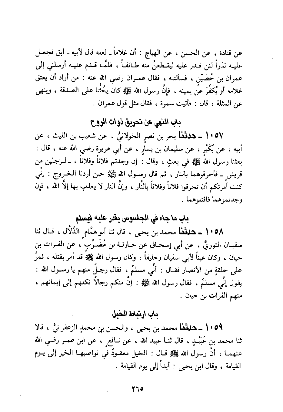 1057 - حَدَّثَنَا بَحْرُ بْنُ نَصْرٍ الْخَوْلَانِيُّ، عَنْ شُعَيْبِ بْنِ اللَّيْثِ، عَنْ أَبِيهِ، عَنْ بُكَيْرٍ، عَنْ سُلَيْمَانَ بْنِ يَسَارٍ، عَنْ أَبِي هُرَيْرَةَ، رَضِيَ اللَّهُ عَنْهُ قَالَ: بَعَثَنَا رَسُولُ اللَّهِ صَلَّى اللهُ عَلَيْهِ وَسَلَّمَ فِي بَعْثٍ وَقَالَ: «إِنْ وَجَدْتُمْ فُلَانًا وَفُلَانًا لِرَجُلَيْنِ مِنْ قُرَيْشٍ فَأَحْرِقُوهُمَا بِالنَّارِ» ثُمَّ قَالَ رَسُولُ اللَّهِ صَلَّى اللهُ عَلَيْهِ وَسَلَّمَ حِينَ أَرَدْنَا الْخُرُوجَ: «إِنِّي §كُنْتُ أَمَرْتُكُمْ أَنْ تُحْرِقُوا فُلَانًا وَفُلَانًا بِالنَّارِ، وَإِنَّ النَّارَ لَا يُعَذِّبُ بِهَا إِلَّا اللَّهُ، فَإِنْ وَجَدْتُمُوهُمَا فَاقْتُلُوهُمَا»