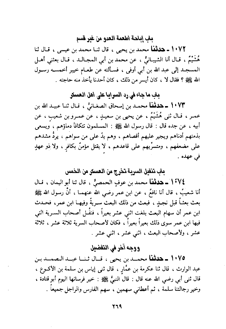 1072 - حَدَّثَنَا مُحَمَّدُ بْنُ يَحْيَى، قَالَ: ثنا مُحَمَّدُ بْنُ عِيسَى، قَالَ: ثنا هُشَيْمٌ، قَالَ: أنا الشَّيْبَانِيُّ، عَنْ مُحَمَّدِ بْنِ أَبِي الْمُجَالِدِ، قَالَ: بَعَثَنِي أَهْلُ الْمَسْجِدِ إِلَى عَبْدِ اللَّهِ بْنِ أَبِي أَوْفَى فَسَأَلْتُهُ عَنْ طَعَامِ خَيْبَرَ أَخَمَّسَهُ رَسُولُ اللَّهِ صَلَّى اللهُ عَلَيْهِ وَسَلَّمَ؟ فَقَالَ: لَا، كَانَ أَيْسَرَ مِنْ ذَلِكَ، §كَانَ أَحَدُنَا يَأْخُذُ مِنْهُ حَاجَتَهُ