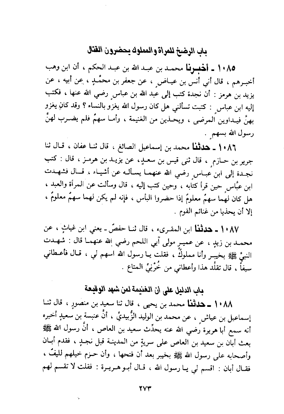 1086 - حَدَّثَنَا مُحَمَّدُ بْنُ إِسْمَاعِيلَ الصَّائِغُ، قَالَ: ثنا عَفَّانُ، قَالَ: ثنا جَرِيرُ بْنُ حَازِمٍ، قَالَ: ثني قَيْسُ بْنُ سَعْدٍ، عَنْ يَزِيدَ بْنِ هُرْمُزَ، قَالَ: كَتَبَ نَجْدَةُ إِلَى ابْنِ عَبَّاسٍ رَضِيَ اللَّهُ عَنْهُمَا يَسْأَلُهُ عَنْ أَشْيَاءَ، قَالَ فَشَهِدَتِ ابْنَ عَبَّاسٍ حِينَ قَرَأَ كِتَابَهُ، وَحِينَ كَتَبَ إِلَيْهِ قَالَ: «وَسَأَلْتَ عَنِ §الْمَرْأَةِ وَالْعَبْدِ هَلْ كَانَ لَهُمَا سَهْمٌ مَعْلُومٌ إِذَا حَضَرُوا الْبَأْسَ، فَإِنَّهُ لَمْ يَكُنْ لَهُمَا سَهْمٌ مَعْلُومٌ إِلَّا أَنْ يُحْذَيَا مِنْ غَنَائِمِ الْقَوْمِ»