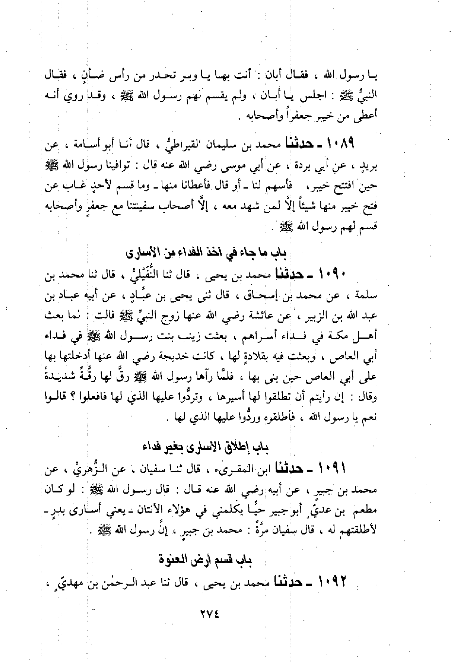 1091 - حَدَّثَنَا ابْنُ الْمُقْرِئِ، قَالَ: ثنا سُفْيَانُ، عَنِ الزُّهْرِيِّ، عَنْ مُحَمَّدِ بْنِ جُبَيْرٍ، عَنْ أَبِيهِ، رَضِيَ اللَّهُ عَنْهُ قَالَ: قَالَ رَسُولُ اللَّهِ صَلَّى اللهُ عَلَيْهِ وَسَلَّمَ: «§لَوْ كَانَ مُطْعِمُ بْنُ عَدِيٍّ أَبُو جُبَيْرٍ حَيًّا يُكَلِّمُنِي فِي هَؤُلَاءِ الْأَنْتَانِ» يَعْنِي أُسَارَى بَدْرٍ «لَأَطْلَقْتُهُمْ لَهُ» قَالَ سُفْيَانُ مَرَّةً: مُحَمَّدُ بْنُ جُبَيْرٍ إِنَّ رَسُولَ اللَّهِ صَلَّى اللهُ عَلَيْهِ وَسَلَّمَ