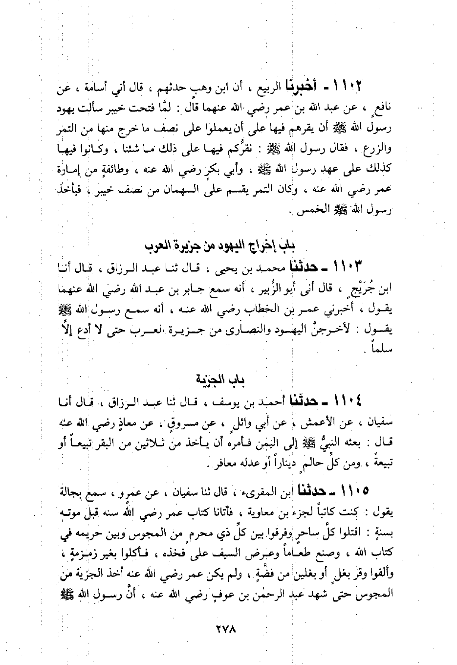 1103 - حَدَّثَنَا مُحَمَّدُ بْنُ يَحْيَى، قَالَ: ثنا عَبْدُ الرَّزَّاقِ، قَالَ: أنا ابْنُ جُرَيْجٍ، قَالَ: أَنِي أَبُو الزُّبَيْرِ، أَنَّهُ سَمِعَ جَابِرَ بْنَ عَبْدِ اللَّهِ، رَضِيَ اللَّهُ عَنْهُمَا يَقُولُ: أَخْبَرَنِي عُمَرُ بْنُ الْخَطَّابِ، رَضِيَ اللَّهُ عَنْهُ، أَنَّهُ سَمِعَ رَسُولَ اللَّهِ صَلَّى اللهُ عَلَيْهِ وَسَلَّمَ يَقُولُ: «§لَأُخْرِجَنَّ الْيَهُودَ، وَالنَّصَارَى مِنْ جَزِيرَةِ الْعَرَبِ حَتَّى لَا أَدَعَ إِلَّا مُسْلِمًا»