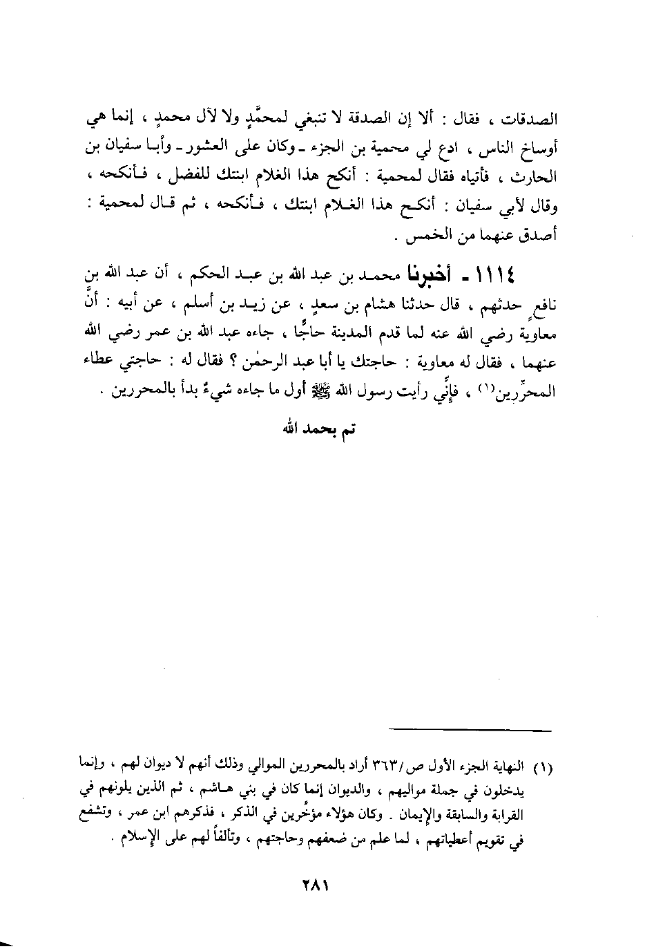 1114 - أَخْبَرَنَا مُحَمَّدُ بْنُ عَبْدِ اللَّهِ بْنِ عَبْدِ الْحَكَمِ، أَنَّ عَبْدَ اللَّهِ بْنَ نَافِعٍ، حَدَّثَهُمْ قَالَ: حَدَّثَنَا هِشَامُ بْنُ سَعْدٍ، عَنْ زَيْدِ بْنِ أَسْلَمَ، عَنْ أَبِيهِ، أَنَّ مُعَاوِيَةَ، رَضِيَ اللَّهُ عَنْهُ، لَمَّا قَدِمَ الْمَدِينَةَ حَاجًّا جَاءَهُ عَبْدُ اللَّهِ بْنُ عُمَرَ رَضِيَ اللَّهُ عَنْهُمَا، فَقَالَ لَهُ مُعَاوِيَةُ: حَاجَتُكَ يَا أَبَا عَبْدِ الرَّحْمَنِ؟، فَقَالَ لَهُ: حَاجَتِي عَطَاءُ الْمُحَرَّرِينَ، فَإِنِّي «رَأَيْتُ رَسُولَ اللَّهِ صَلَّى اللهُ عَلَيْهِ وَسَلَّمَ §أَوَّلَ مَا جَاءَهُ شَيْءٌ بَدَأَ بِالْمُحَرَّرِينَ»