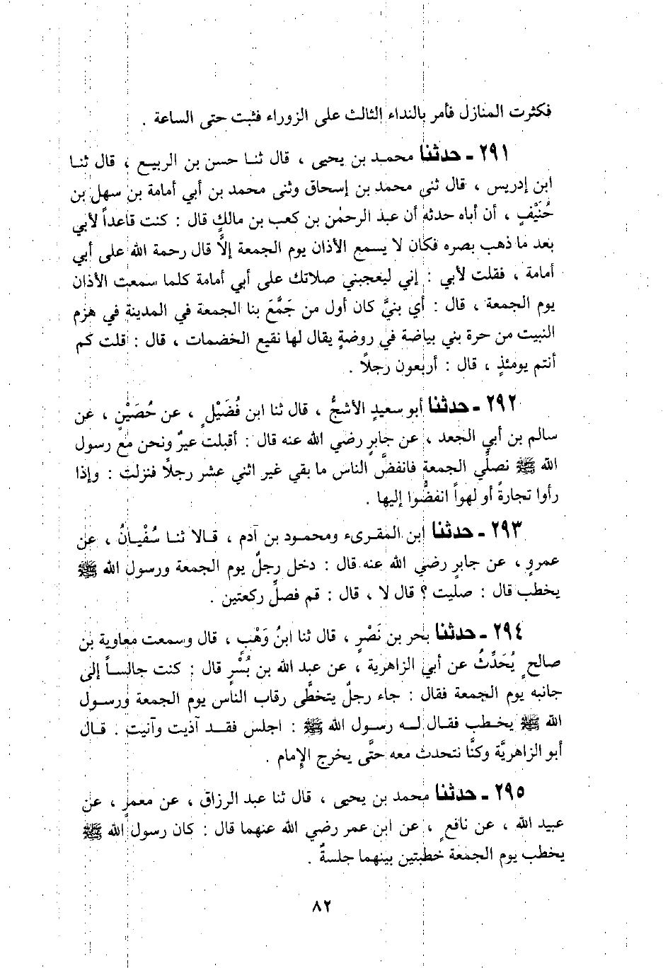 291 - حَدَّثَنَا مُحَمَّدُ بْنُ يَحْيَى، قَالَ: ثَنَا حَسَنُ بْنُ الرَّبِيعِ، قَالَ: ثَنَا ابْنُ إِدْرِيسَ، قَالَ: ثَنِي مُحَمَّدُ بْنُ إِسْحَاقَ، وَثَنِي مُحَمَّدُ بْنُ أَبِي أُمَامَةَ بْنِ سَهْلِ بْنِ حُنَيْفٍ، أَنَّ أَبَاهُ حَدَّثَهُ أَنَّ عَبْدَ الرَّحْمَنِ بْنَ كَعْبِ بْنِ مَالِكٍ قَالَ: " كُنْتُ قَائِدًا لِأَبِي بَعْدَ مَا ذَهَبَ بَصَرُهُ فَكَانَ لَا يَسْمَعُ الْأَذَانَ يَوْمَ الْجُمُعَةِ إِلَّا قَالَ: «رَحْمَةُ اللَّهِ عَلَى أَبِي أُمَامَةَ» فَقُلْتُ لِأَبِي: إِنِّي لَيُعْجِبُنِي صَلَاتُكَ عَلَى أَبِي أُمَامَةَ كُلَّمَا سَمِعْتَ الْأَذَانَ يَوْمَ الْجُمُعَةِ قَالَ: " أَيْ بُنَيَّ كَانَ §أَوَّلَ مَنْ جَمَعَ بِنَا الْجُمُعَةَ فِي الْمَدِينَةِ فِي هَزْمِ النَّبِيتِ مِنْ حَرَّةِ بَنِي بَيَاضَةَ فِي رَوْضَةٍ يُقَالُ لَهَا: نَقِيعُ الْخَضَمَاتِ " قَالَ: قُلْتُ: كَمْ أَنْتُمْ يَوْمَئِذٍ؟ قَالَ: «أَرْبَعُونَ رَجُلًا»