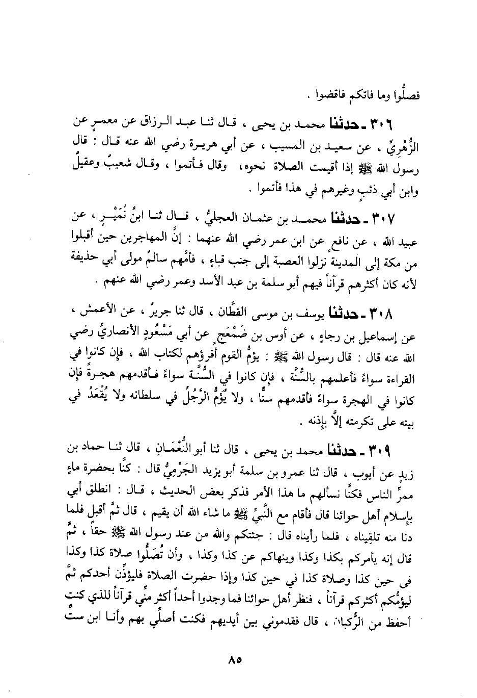 308 - حَدَّثَنَا يُوسُفُ بْنُ مُوسَى الْقَطَّانُ، قَالَ: ثَنَا جَرِيرٌ، عَنِ الْأَعْمَشِ، عَنْ إِسْمَاعِيلَ بْنِ رَجَاءٍ، عَنْ أَوْسِ بْنِ ضَمْعَجٍ، عَنْ أَبِي مَسْعُودٍ الْأَنْصَارِيِّ، رَضِيَ اللَّهُ عَنْهُ قَالَ: قَالَ رَسُولُ اللَّهِ صَلَّى اللهُ عَلَيْهِ وَسَلَّمَ: «§يَؤُمُّ الْقَوْمَ أَقْرَؤُهُمْ لِكِتَابِ اللَّهِ، فَإِنْ كَانُوا فِي الْقِرَاءَةِ سَوَاءً فَأَعْلَمُهُمْ بِالسُّنَّةِ، فَإِنْ كَانُوا فِي السُّنَّةِ سَوَاءً فَأَقْدَمُهُمْ هِجْرَةً، فَإِنْ كَانُوا فِي الْهِجْرَةِ سَوَاءً فَأَقْدَمُهُمْ سِنًّا، وَلَا يُؤَمُّ الرَّجُلُ فِي سُلْطَانِهِ، وَلَا يُقْعَدُ فِي بَيْتِهِ عَلَى تَكْرِمَتِهِ إِلَّا بِإِذْنِهِ»