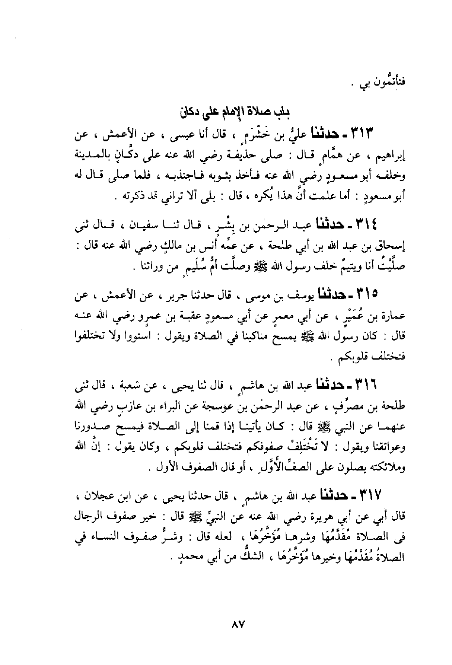 313 - حَدَّثَنَا عَلِيُّ بْنُ خَشْرَمٍ، قَالَ: أَنَا عِيسَى، عَنِ الْأَعْمَشِ، عَنْ إِبْرَاهِيمَ، عَنْ هَمَّامٍ، قَالَ: §صَلَّى حُذَيْفَةُ رَضِيَ اللَّهُ عَنْهُ عَلَى دُكَّانٍ بِالْمَدِينَةِ وَخَلْفَهُ أَبُو مَسْعُودٍ رَضِيَ اللَّهُ عَنْهُ فَأَخَذَ بِثَوْبِهِ فَاجْتَذَبَهُ فَلَمَّا صَلَّى قَالَ لَهُ أَبُو مَسْعُودٍ: أَمَا عَلِمْتَ أَنَّ هَذَا يُكْرَهُ؟ قَالَ: بَلَى أَلَا تَرَانِي قَدْ ذَكَرْتُهُ