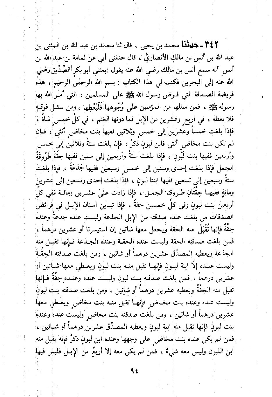 342 - حَدَّثَنَا مُحَمَّدُ بْنُ يَحْيَى، قَالَ: ثَنَا مُحَمَّدُ بْنُ عَبْدِ اللَّهِ بْنِ الْمُثَنَّى بْنِ عَبْدِ اللَّهِ بْنِ أَنَسِ بْنِ مَالِكٍ الْأَنْصَارِيُّ، قَالَ: حَدَّثَنِي أَبِي، عَنْ ثُمَامَةَ بْنِ عَبْدِ اللَّهِ بْنِ أَنَسٍ، أَنَّهُ سَمِعَ أَنَسَ بْنَ مَالِكٍ رَضِيَ اللَّهُ عَنْهُ يَقُولُ: بَعَثَنِي أَبُو بَكْرٍ الصِّدِّيقُ رَضِيَ اللَّهُ عَنْهُ إِلَى الْبَحْرَيْنِ فَكَتَبَ لِي هَذَا الْكِتَابَ: «بِسْمِ اللَّهِ الرَّحْمَنِ الرَّحِيمِ §هَذِهِ فَرِيضَةُ الصَّدَقَةِ الَّتِي فَرَضَ رَسُولُ اللَّهِ صَلَّى اللهُ عَلَيْهِ وَسَلَّمَ عَلَى الْمُسْلِمِينَ الَّتِي أَمَرَ اللَّهُ بِهَا رَسُولَهُ صَلَّى اللهُ عَلَيْهِ وَسَلَّمَ فَمَنْ سُئِلَهَا مِنَ الْمُؤْمِنِينَ عَلَى وجُوهِهَا فَلْيُعْطِهَا وَمَنْ سُئِلَ فَوْقَهُ فَلَا يُعْطِهِ فِي أَرْبَعٍ وَعِشْرِينَ مِنَ الْإِبِلِ فَمَا دُونَهَا الْغَنَمُ فِي كُلِّ خَمْسٍ شَاةٌ فَإِذَا بَلَغَتْ خَمْسًا وَعِشْرِينَ إِلَى خَمْسٍ وَثَلَاثِينَ فَفِيهَا بِنْتُ مَخَاضٍ أُنْثَى فَإِنْ لَمْ تَكُنْ بِنْتُ مَخَاضٍ أُنْثَى فَابْنُ لَبُونٍ ذَكَرٌ فَإِنْ بَلَغَتْ سِتَّةً وَثَلَاثِينَ إِلَى خَمْسٍ وَأَرْبَعِينَ فَفِيهَا بِنْتُ لَبُونٍ فَإِذَا بَلَغَتْ سِتَّةً وَأَرْبَعِينَ إِلَى سِتِّينَ فَفِيهَا حَقَّةٌ طَرُوقَةُ الْجَمَلِ فَإِذَا بَلَغَتْ إِحْدَى وَسِتِّينَ إِلَى خَمْسٍ وَسَبْعِينَ فَفِيهَا جَذَعَةٌ، فَإِذَا بَلَغَتْ سِتَّةً وَسَبْعِينَ إِلَى تِسْعِينَ فَفِيهَا ابْنَتَا لَبُونٍ فَإِذَا بَلَغَتْ إِحْدَى وَتِسْعِينَ إِلَى عِشْرِينَ وَمِائَةٍ فَفِيهَا حِقَّتَانِ طَرُوقَتَا الْجَمَلِ فَإِذَا زَادَتْ عَلَى عِشْرِينَ وَمِائَةٍ فَفِي كُلِّ أَرْبَعِينَ بِنْتُ لَبُونٍ وَفِي كُلِّ خَمْسِينَ حِقَّةٌ فَإِذَا تَبَايَنَ أَسْنَانُ الْإِبِلِ فِي فَرَائِضِ الصَّدَقَاتِ مَنْ بَلَغَتْ عِنْدَهُ صَدَقَتُهُ مِنَ الْإِبِلِ الْجَذَعَةَ وَلَيْسَتْ عِنْدَهُ جَذَعَةٌ وَعِنْدَهُ حِقَّةٌ فَإِنَّهَا تُقْبَلُ مِنْهُ الْحِقَّةُ وَيُجْعَلُ مَعَهَا شَاتَيْنِ إِنِ اسْتَيْسَرَتَا أَوْ عِشْرِينَ دِرْهَمًا فَمَنْ بَلَغَتْ صَدَقَتُهُ الْحِقَّةَ وَلَيْسَتْ عِنْدَهُ الْحِقَّةُ وَعِنْدَهُ الْجَذَعَةُ فَإِنَّهَا تُقْبَلُ مِنْهُ الْجَذَعَةُ وَيُعْطِيهِ الْمُصَدِّقُ عِشْرِينَ دِرْهَمًا أَوْ شَاتَيْنِ، وَمَنْ بَلَغَتْ صَدَقَتُهُ الْحِقَّةَ وَلَيْسَتْ عِنْدَهُ إِلَّا ابْنَةُ لَبُونٍ فَإِنَّهَا تُقْبَلُ مِنْهُ بِنْتُ لَبُونٍ وَيُعْطِي مَعَهَا شَاتَيْنِ أَوْ عِشْرِينَ دِرْهَمًا فَمَنْ بَلَغَتْ صَدَقَتُهُ بِنْتَ لَبُونٍ وَلَيْسَتْ عِنْدَهُ وَعِنْدَهُ حِقَّةٌ فَإِنَّهَا تُقْبَلُ مِنْهُ الْحِقَّةُ وَيُعْطِيهِ الْمُصَدِّقُ عِشْرِينَ دِرْهَمًا أَوْ شَاتَيْنِ وَمَنْ بَلَغَتْ صَدَقَتُهُ بِنْتَ لَبُونٍ وَلَيْسَتْ عِنْدَهُ وَعِنْدَهُ بِنْتُ مَخَاضٍ فَإِنَّهَا تُقْبَلُ مِنْهُ بِنْتُ مَخَاضٍ وَيُعْطِي مَعَهَا عِشْرِينَ دِرْهَمًا أَوْ شَاتَيْنِ وَمَنْ بَلَغَتْ صَدَقَتُهُ بِنْتَ مَخَاضٍ وَلَيْسَتْ عِنْدَهُ وَعِنْدَهُ بِنْتُ لَبُونٍ فَإِنَّهَا تُقْبَلُ مِنْهُ ابْنَةُ لَبُونٍ وَيُعْطِيهِ الْمُصَدِّقُ عِشْرِينَ دِرْهَمًا أَوْ شَاتَيْنِ فَمَنْ لَمْ يَكُنْ عِنْدَهُ بِنْتُ مَخَاضٍ عَلَى وَجْهِهَا وَعِنْدَهُ ابْنُ لَبُونٍ ذَكَرٌ فَإِنَّهُ يَقْبَلُ مِنْهُ ابْنُ اللَّبُونِ وَلَيْسَ مَعَهُ شَيْءٌ فَمَنْ لَمْ يَكُنْ مَعَهُ إِلَّا أَرْبَعٌ مِنَ الْإِبِلِ فَلَيْسَ فِيهَا شَيْءٌ إِلَّا أَنْ يَشَاءَ رَبُّهَا فَإِذَا بَلَغَتْ خَمْسًا مِنَ الْإِبِلِ فَفِيهَا شَاةٌ وَفِي صَدَقَةِ الْغَنَمِ فِي سَائِمَتِهَا إِذَا كَانَتْ أَرْبَعِينَ شَاةً فَفِيهَا شَاةٌ إِلَى عِشْرِينَ وَمِائَةٍ فَإِذَا 