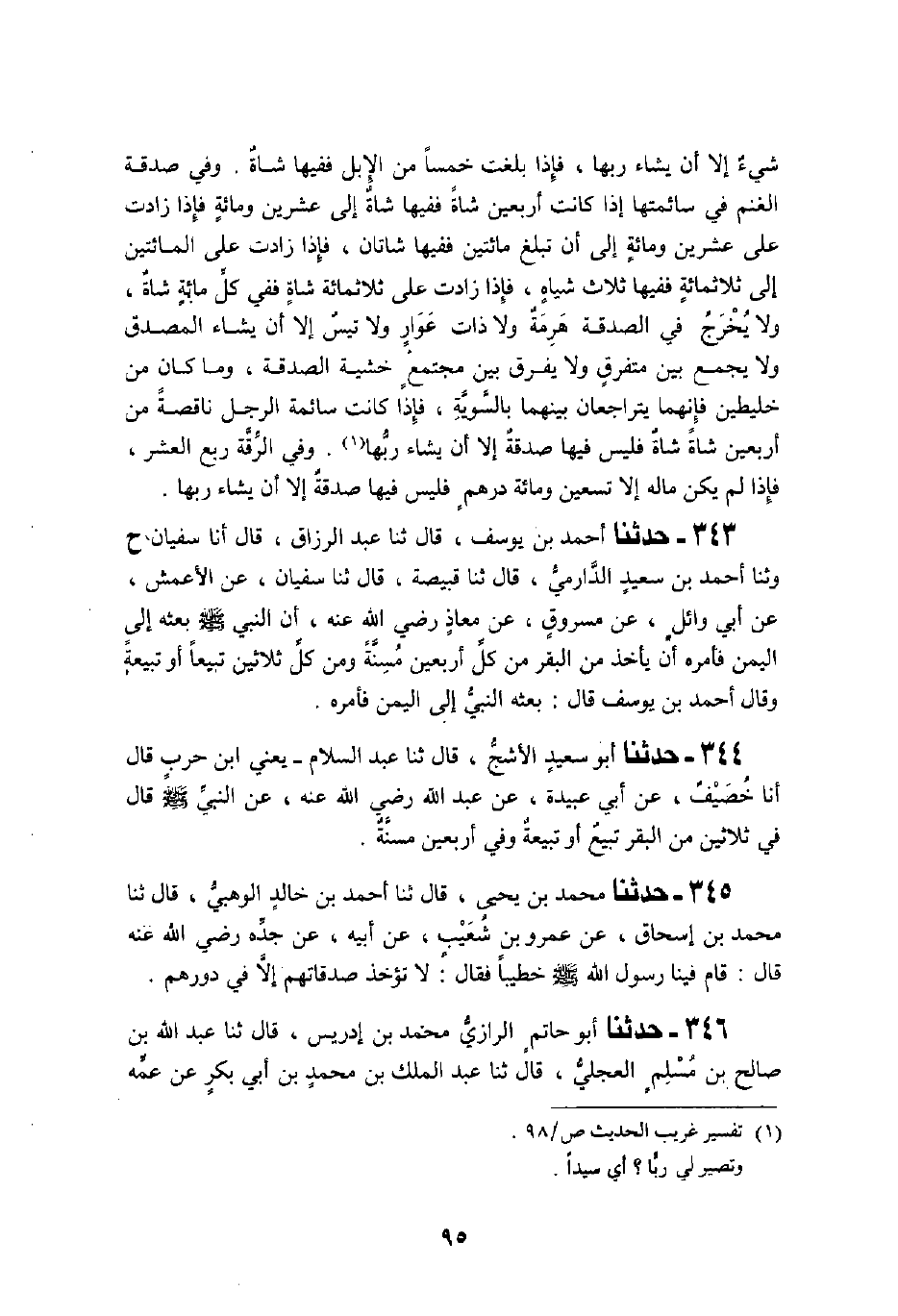 343 - حَدَّثَنَا أَحْمَدُ بْنُ يُوسُفَ، قَالَ: ثَنَا عَبْدُ الرَّزَّاقِ، قَالَ: أَنَا سُفْيَانُ، ح وَثَنَا أَحْمَدُ بْنُ سَعِيدٍ الدَّارِمِيُّ، قَالَ: ثَنَا قَبِيصَةُ، قَالَ: ثَنَا سُفْيَانُ، عَنِ الْأَعْمَشِ، عَنْ أَبِي وَائِلٍ، عَنْ مَسْرُوقٍ، عَنْ مُعَاذٍ، رَضِيَ اللَّهُ عَنْهُ أَنَّ النَّبِيَّ صَلَّى اللهُ عَلَيْهِ وَسَلَّمَ بَعَثَهُ إِلَى الْيَمَنِ §فَأَمَرَهُ أَنْ يَأْخُذَ مِنَ الْبَقَرِ مِنْ كُلِّ أَرْبَعِينَ مُسِنَّةً، وَمَنْ كُلِّ ثَلَاثِينَ تَبِيعًا أَوْ تَبِيعَةً " , وَقَالَ أَحْمَدُ بْنُ يُوسُفَ: قَالَ: بَعَثَهُ النَّبِيُّ إِلَى الْيَمَنِ فَأَمَرَهُ