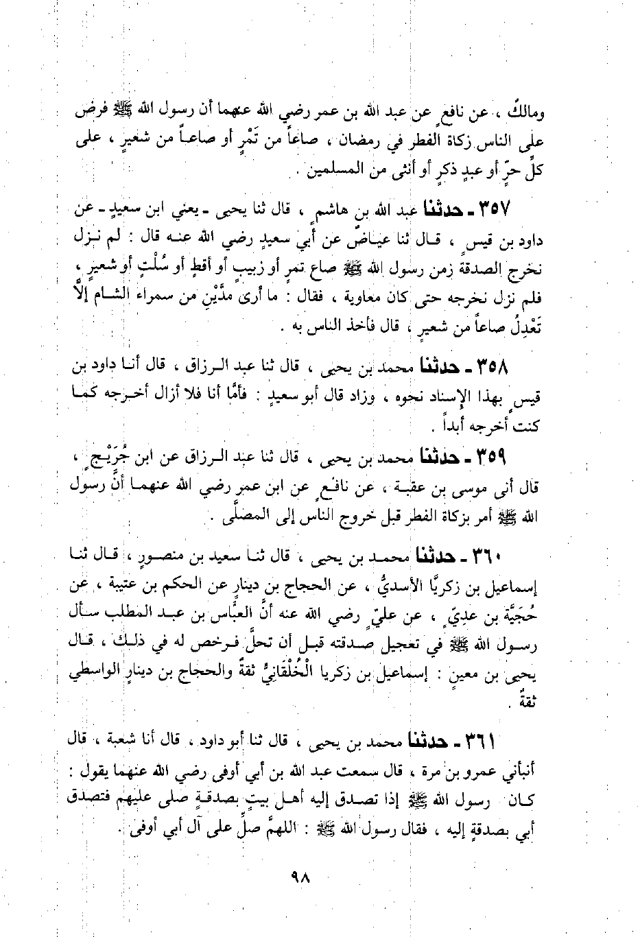 359 - حَدَّثَنَا مُحَمَّدُ بْنُ يَحْيَى، قَالَ: ثَنَا عَبْدُ الرَّزَّاقِ، عَنِ ابْنِ جُرَيْجٍ، قَالَ أَنِي مُوسَى بْنُ عُقْبَةَ، عَنْ نَافِعٍ، عَنِ ابْنِ عُمَرَ، رَضِيَ اللَّهُ عَنْهُمَا أَنَّ رَسُولَ اللَّهِ صَلَّى اللهُ عَلَيْهِ وَسَلَّمَ «§أَمَرَ بِزَكَاةِ الْفِطْرِ قَبْلَ خُرُوجِ النَّاسِ إِلَى الْمُصَلَّى»