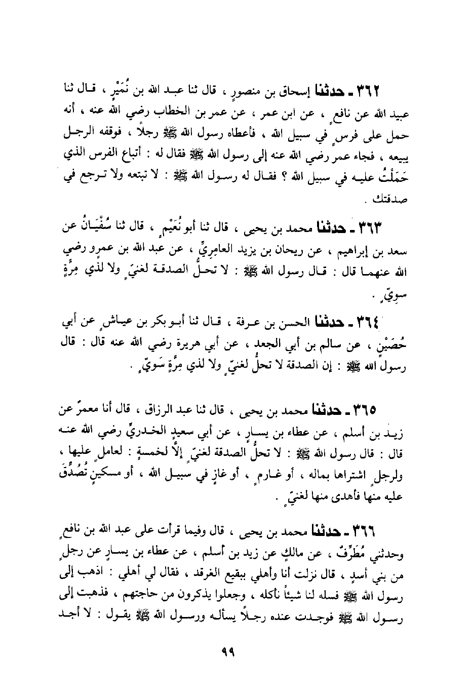 365 - حَدَّثَنَا مُحَمَّدُ بْنُ يَحْيَى، قَالَ: ثَنَا عَبْدُ الرَّزَّاقِ، قَالَ: أَنَا مَعْمَرٌ، عَنْ زَيْدِ بْنِ أَسْلَمَ، عَنْ عَطَاءِ بْنِ يَسَارٍ، عَنْ أَبِي سَعِيدٍ الْخُدْرِيِّ، رَضِيَ اللَّهُ عَنْهُ قَالَ: قَالَ رَسُولُ اللَّهِ صَلَّى اللهُ عَلَيْهِ وَسَلَّمَ: «§لَا تَحِلُّ الصَّدَقَةُ لِغَنِيٍّ إِلَّا لِخَمْسَةٍ لِعَامِلٍ عَلَيْهَا وَلِرَجُلٍ اشْتَرَاهَا بِمَالِهِ أَوْ غَارِمٍ أَوْ غَازٍ فِي سَبِيلِ اللَّهِ أَوْ مِسْكِينٍ تُصُدِّقَ عَلَيْهِ مِنْهَا فَأَهْدَى مِنْهَا لِغَنِيٍّ»