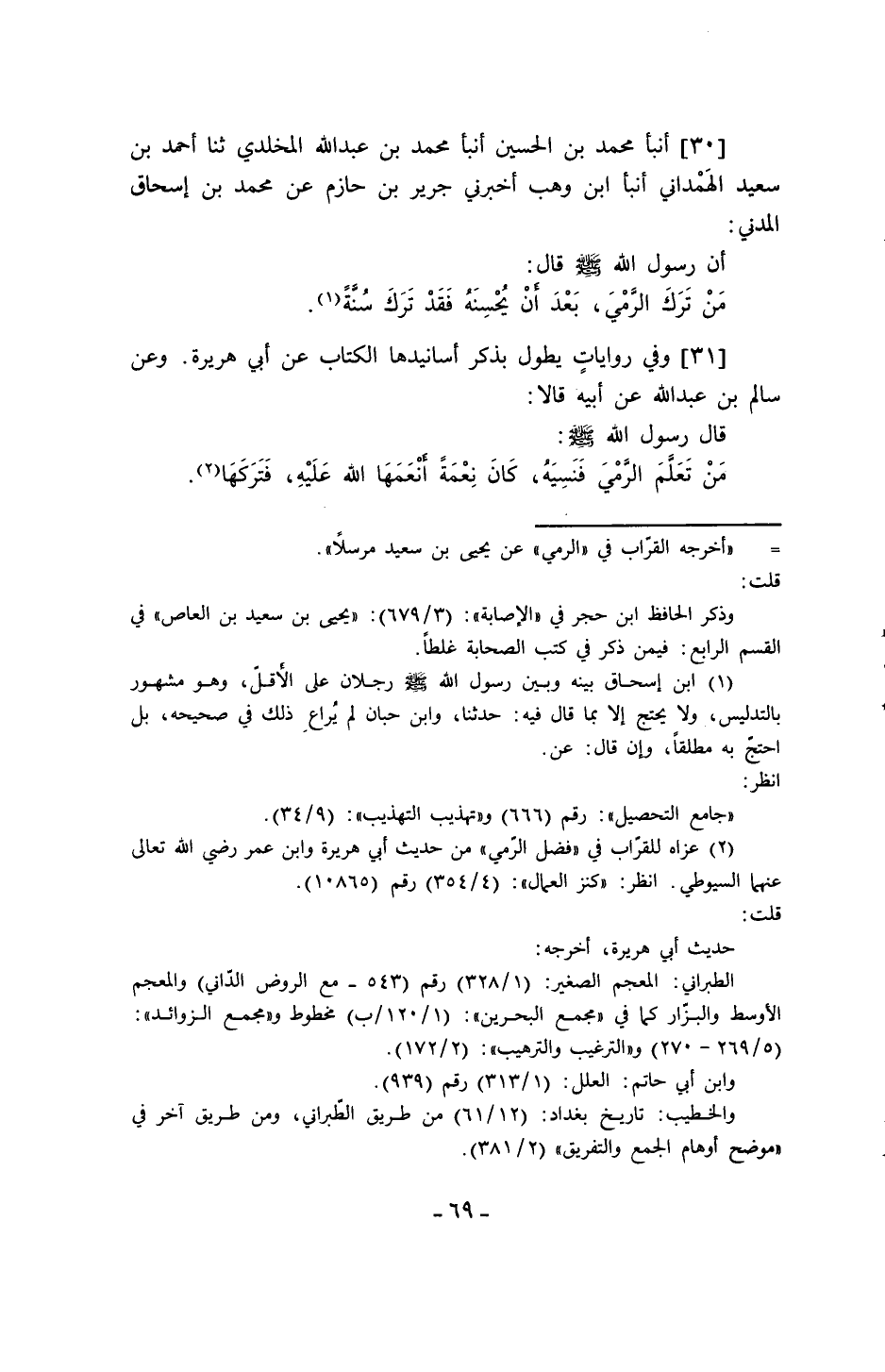 30 - أنبأ مُحَمَّدُ بْنُ الْحُسَيْنِ، أنبأ مُحَمَّدُ بْنُ عَبْدِ اللَّهِ الْمَخْلَدِيُّ، ثنا أَحْمَدُ بْنُ سَعِيدٍ الْهَمْدَانِيُّ، أنبأ ابْنُ وَهْبٍ، أَخْبَرَنِي جَرِيرُ بْنُ حَازِمٍ، عَنْ مُحَمَّدِ بْنِ إِسْحَاقَ الْمَدَنِيِّ، أَنَّ رَسُولَ اللَّهِ صَلَّى اللَّهُ عَلَيْهِ وَسَلَّمَ قَالَ: «§مَنْ تَرَكَ الرَّمْيَ، بَعْدَ أَنْ يُحْسِنَهُ فَقَدْ تَرَكَ سُنَّةً»