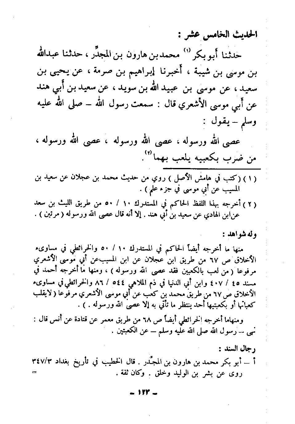 16 - حَدَّثَنَا أَبُو بَكْرٍ مُحَمَّدُ بْنُ هَارُونَ بْنِ الْمُجَدَّرِ , حَدَّثَنَا عَبْدُ اللَّهِ بْنُ مُوسَى بْنِ شَيْبَةَ , أَخْبَرَنَا إِبْرَاهِيمُ بْنُ صِرْمَةَ , عَنْ يَحْيَى بْنِ سَعِيدٍ , عَنْ مُوسَى بْنِ عُبَيْدِ اللَّهِ بْنِ سُوَيْدٍ , عَنْ سَعِيدِ بْنِ أَبِي هِنْدٍ , عَنْ أَبِي مُوسَى الْأَشْعَرِيِّ , قَالَ: سَمِعْتُ رَسُولَ اللَّهِ صَلَّى اللَّهُ عَلَيْهِ وَسَلَّمَ يَقُولُ: «§عَصَى اللَّهَ وَرَسُولَهُ , عَصَى اللَّهَ وَرَسُولَهُ , عَصَى اللَّهَ وَرَسُولَهُ مَنْ ضَرَبَ بِكَعْبَيْهِ يَلْعَبُ بِهِمَا»