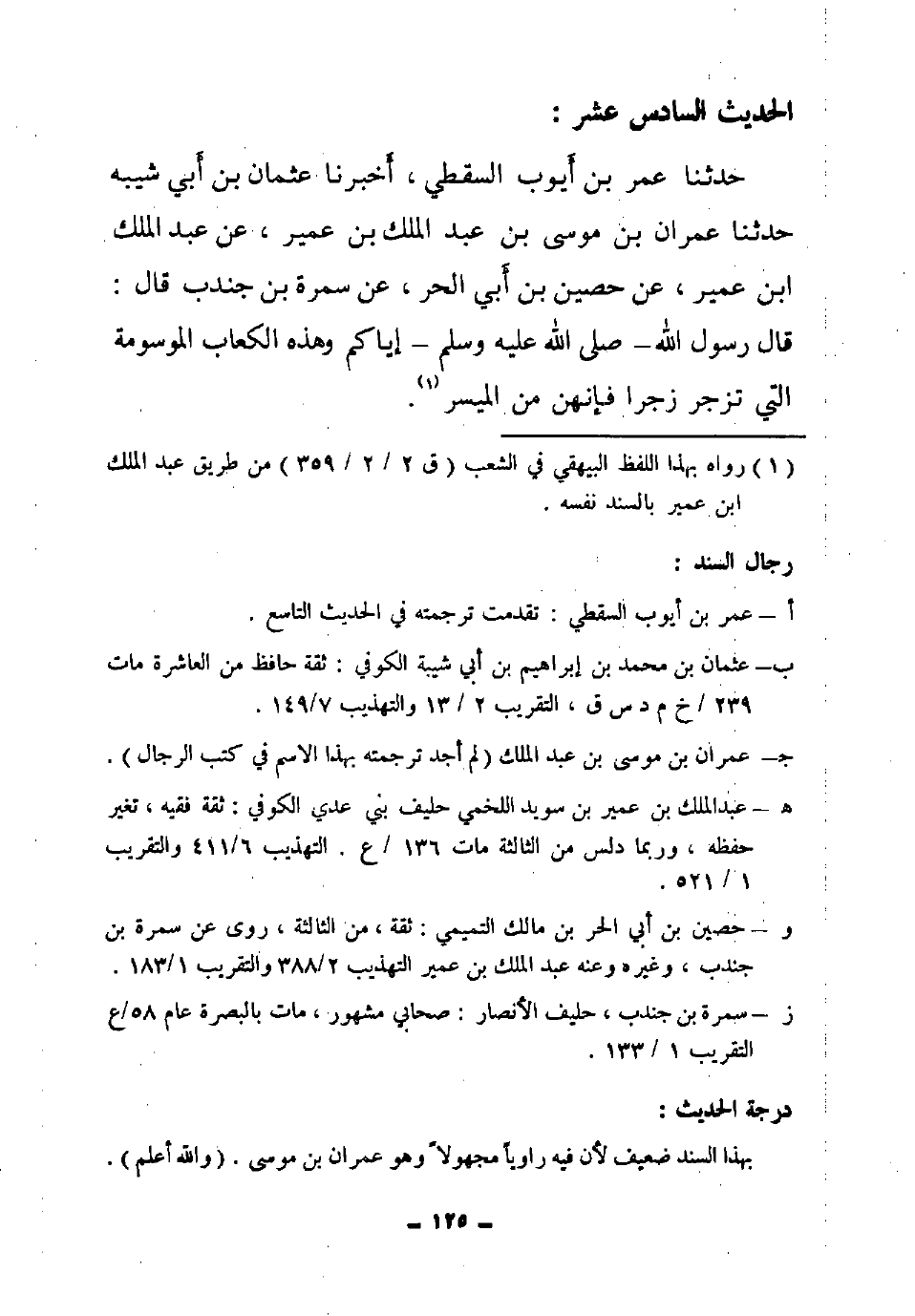 17 - حَدَّثَنَا عُمَرُ بْنُ أَيُّوبَ السَّقَطِيُّ , أَخْبَرَنَا عُثْمَانُ بْنُ أَبِي شَيْبَةَ , حَدَّثَنَا عِمْرَانُ بْنُ مُوسَى بْنِ عَبْدِ الْمَلِكِ بْنِ عُمَيْرٍ , عَنْ حُصَيْنِ بْنِ أَبِي الْحُرِّ , عَنْ سَمُرَةَ بْنِ جُنْدُبٍ , قَالَ: قَالَ رَسُولُ اللَّهِ صَلَّى اللَّهُ عَلَيْهِ وَسَلَّمَ: «§إِيَّاكُمْ وَهَذِهِ الْكِعَابَ الْمَوْسُومَةَ الَّتِي تُزْجَرُ زَجْرًا فَإِنَّهُنَّ مِنَ الْمَيْسِرَ»