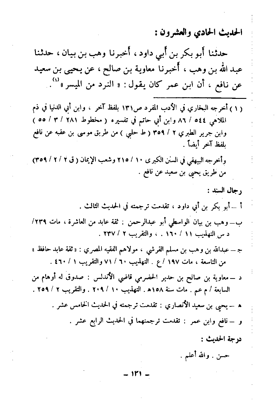 22 - حَدَّثَنَا أَبُو بَكْرِ بْنُ أَبِي دَاوُدَ , أَخْبَرَنَا وَهْبُ بْنُ بَيَانٍ , حَدَّثَنَا عَبْدُ اللَّهِ بْنُ وَهْبٍ , أَخْبَرَنَا مُعَاوِيَةُ بْنُ صَالِحٍ , عَنْ يَحْيَى بْنِ سَعِيدٍ , عَنْ نَافِعٍ , أَنَّ عَبْدَ اللَّهِ بْنَ عُمَرَ كَانَ يَقُولُ: «§النَّرْدُ مِنَ الْمَيْسِرِ»