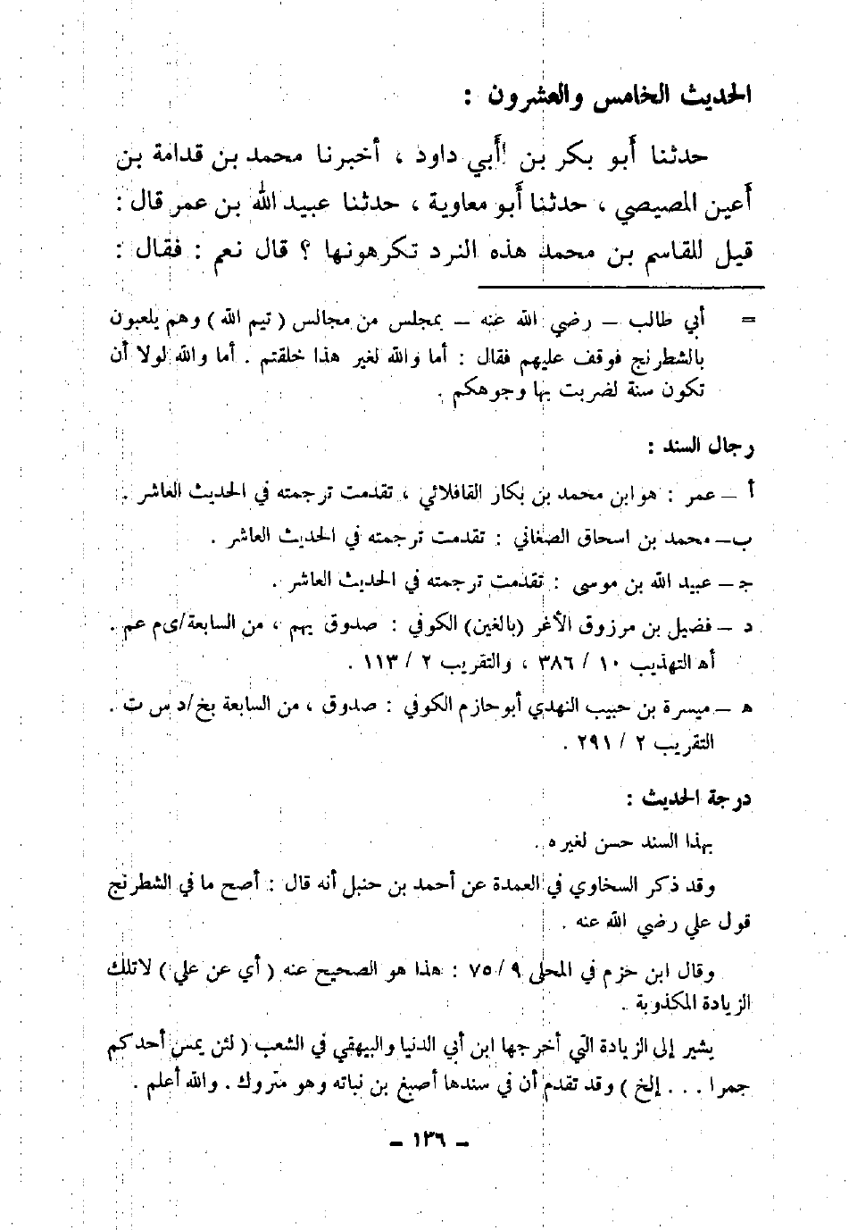 26 - حَدَّثَنَا أَبُو بَكْرِ بْنُ أَبِي دَاوُدَ , أَخْبَرَنَا مُحَمَّدُ بْنُ قُدَامَةَ بْنِ أَعْيَنَ الْمِصِّيصِيُّ , حَدَّثَنَا أَبُو مُعَاوِيَةَ , حَدَّثَنَا عُبَيْدُ اللَّهِ بْنُ عُمَرَ , قَالَ: قِيلَ لِلْقَاسِمِ بْنِ مُحَمَّدٍ: " §هَذِهِ النَّرْدُ تَكْرَهُونَهَا؟ قَالَ: نَعَمْ , -[137]- فَقَالَ: فَالشِّطْرَنْجُ , قَالَ: كُلُّ مَا أَلْهَى عَنْ ذِكْرِ اللَّهِ عَزَّ وَجَلَّ فَهُوَ مِنَ الْمَيْسِرِ "
