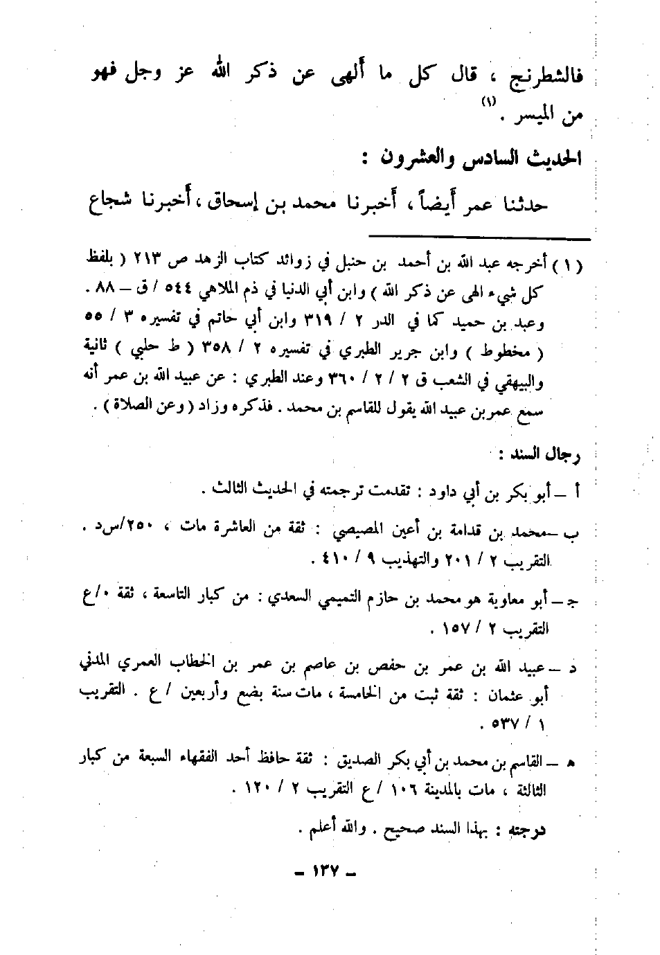 27 - حَدَّثَنَا عُمَرُ , أَيْضًا , أَخْبَرَنَا مُحَمَّدُ بْنُ إِسْحَاقَ , أَخْبَرَنَا شُجَاع -[138]- ُ بْنُ الْوَلِيدِ , أَخْبَرَنَا عُبَيْدُ اللَّهِ بْنُ عُمَرَ , قَالَ: سُئِلَ ابْنُ عُمَرَ عَنِ الشِّطْرَنْجِ , فَقَالَ: «§هِيَ شَرٌّ مِنَ النَّرْدِ» .