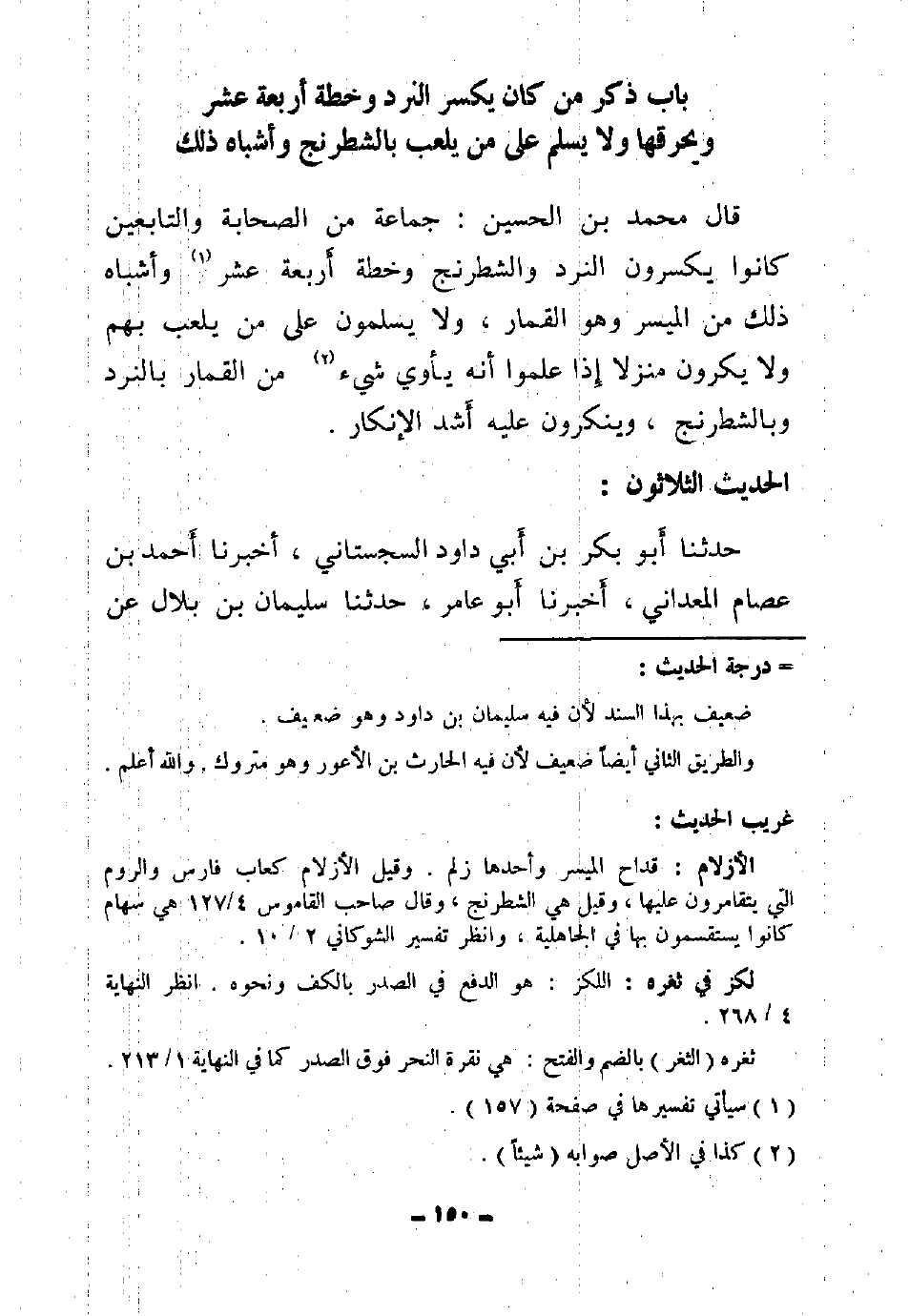 §بَابُ ذِكْرِ مَنْ كَانَ يَكْسِرُ النَّرْدَ وَخُطَّةَ أَرْبَعَةَ عَشَرَ وَيَحْرِقُهَا وَلَا يُسَلِّمُ عَلَى مَنْ يَلْعَبُ بِالشِّطْرَنْجِ وَأَشْبَاهِ ذَلِكَ قَالَ مُحَمَّدُ بْنُ الْحُسَيْنِ: جَمَاعَةٌ مِنَ الصَّحَابَةِ وَالتَّابِعِينَ كَانُوا يَكْسِرُونَ النَّرْدَ وَالشِّطْرَنَجَ وَخُطَّةَ أَرْبَعَةَ عَشَرَ وَأَشْبَاهَ ذَلِكَ مِنَ الْمَيْسِرِ وَهُوَ الْقِمَارُ وَلَا يُسَلِّمُونَ عَلَى مَنْ يَلْعَبُ بِهِمْ وَلَا يُكْرُونَ مَنْزِلًا إِذَا عَلِمُوا أَنَّهُ يَأْوِيَ شَيْئًا مِنَ الْقِمَارِ بِالنَّرْدِ وَبِالشِّطْرَنْجِ وَيُنْكِرُونَ عَلَيْهِ أَشَدَّ الْإِنْكَارِ.