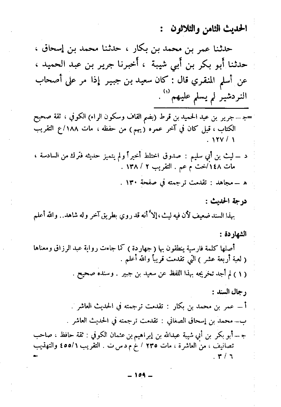 39 - حَدَّثَنَا عُمَرُ بْنُ مُحَمَّدِ بْنِ بَكَّارٍ , حَدَّثَنَا مُحَمَّدُ بْنُ إِسْحَاقَ , حَدَّثَنَا أَبُو بَكْرِ بْنُ أَبِي شَيْبَةَ , أَخْبَرَنَا جَرِيرُ بْنُ عَبْدِ الْحَمِيدِ , عَنْ أَسْلَمَ الْمِنْقَرِيِّ , قَالَ: «§كَانَ سَعِيدُ بْنُ جُبَيْرٍ إِذَا مَرَّ عَلَى أَصْحَابِ النَّرْدَشِيرِ لَمْ يُسَلِّمْ عَلَيْهِمْ»