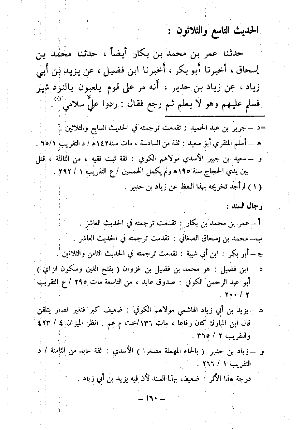 40 - حَدَّثَنَا عُمَرُ بْنُ مُحَمَّدِ , أَيْضًا , حَدَّثَنَا مُحَمَّدُ بْنُ إِسْحَاقَ , أَخْبَرَنَا أَبُو بَكْرٍ , أَخْبَرَنَا ابْنُ فُضَيْلٍ , عَنْ يَزِيدَ بْنِ أَبِي زِيَادٍ , عَنْ زِيَادِ بْنِ حُدَيْرٍ: أَنَّهُ مَرَّ عَلَى قَوْمٍ يَلْعَبُونَ بِالنَّرْدَشِيرِ فَسَلَّمَ عَلَيْهِمْ وَهُوَ لَا يَعْلَمُ ثُمَّ رَجَعَ فَقَالَ: «§رُدُّوا عَلَيَّ سَلَامِي» .