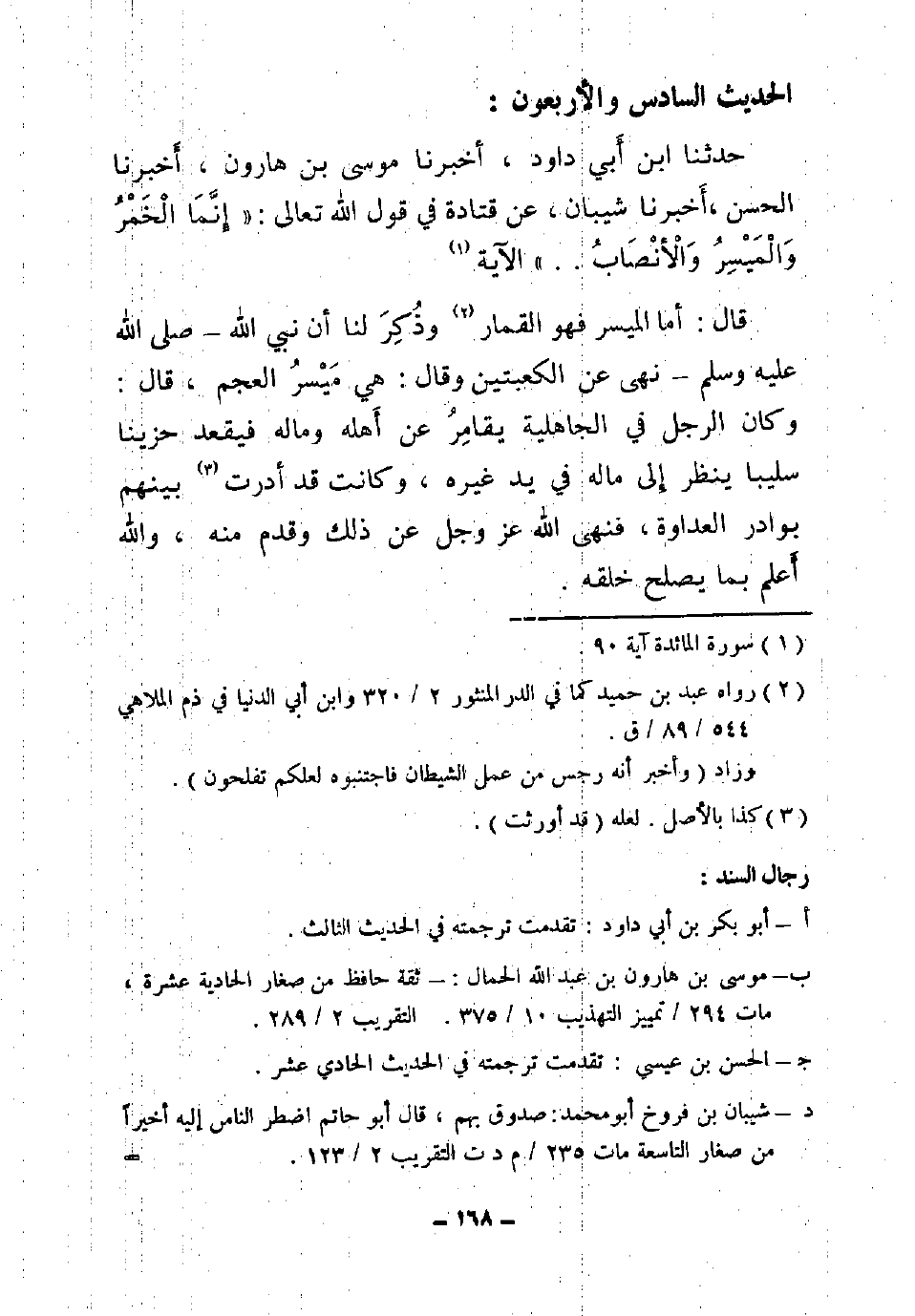 47 - حَدَّثَنَا ابْنُ أَبِي دَاوُدَ , أَخْبَرَنَا مُوسَى بْنُ هَارُونَ , أَخْبَرَنَا الْحَسَنُ , أَخْبَرَنَا شَيْبَانُ , عَنْ قَتَادَةَ , فِي قَوْلِ اللَّهِ عَزَّ وَجَلَّ: " {إِنَّمَا الْخَمْرُ وَالْمَيْسِرُ وَالْأَنْصَابُ} [المائدة: 90] قَالَ: أَمَّا الْمَيْسِرُ فَهُوَ الْقِمَارُ , وَذُكِرَ لَنَا أَنَّ نَبِيَّ اللَّهِ صَلَّى اللَّهُ عَلَيْهِ وَسَلَّمَ نَهَى عَنِ الْكَعْبَتَيْنِ وَقَالَ: «§هِيَ مَيْسِرُ الْعَجَمِ» , قَالَ: وَكَانَ الرَّجُلُ فِي الْجَاهِلِيَّةِ يُقَامِرُ عَنْ أَهْلِهِ وَمَالِهِ فَيَقْعُدُ حَزِينًا سَلِيبًا يَنْظُرُ إِلَى مَالِهِ فِي يَدِ غَيْرِهِ , وَكَانَتْ تُوَارِثُ بَيْنَهُمُ الْعَدَاوَةَ وَأَضْغَانًا , فَنَهَى اللَّهُ عَزَّ وَجَلَّ عَنْ ذَلِكَ وَقَدَّمَ فِيهِ , وَاللَّهُ أَعْلَمُ بِمَا يُصْلِحُ خَلْقَهُ.