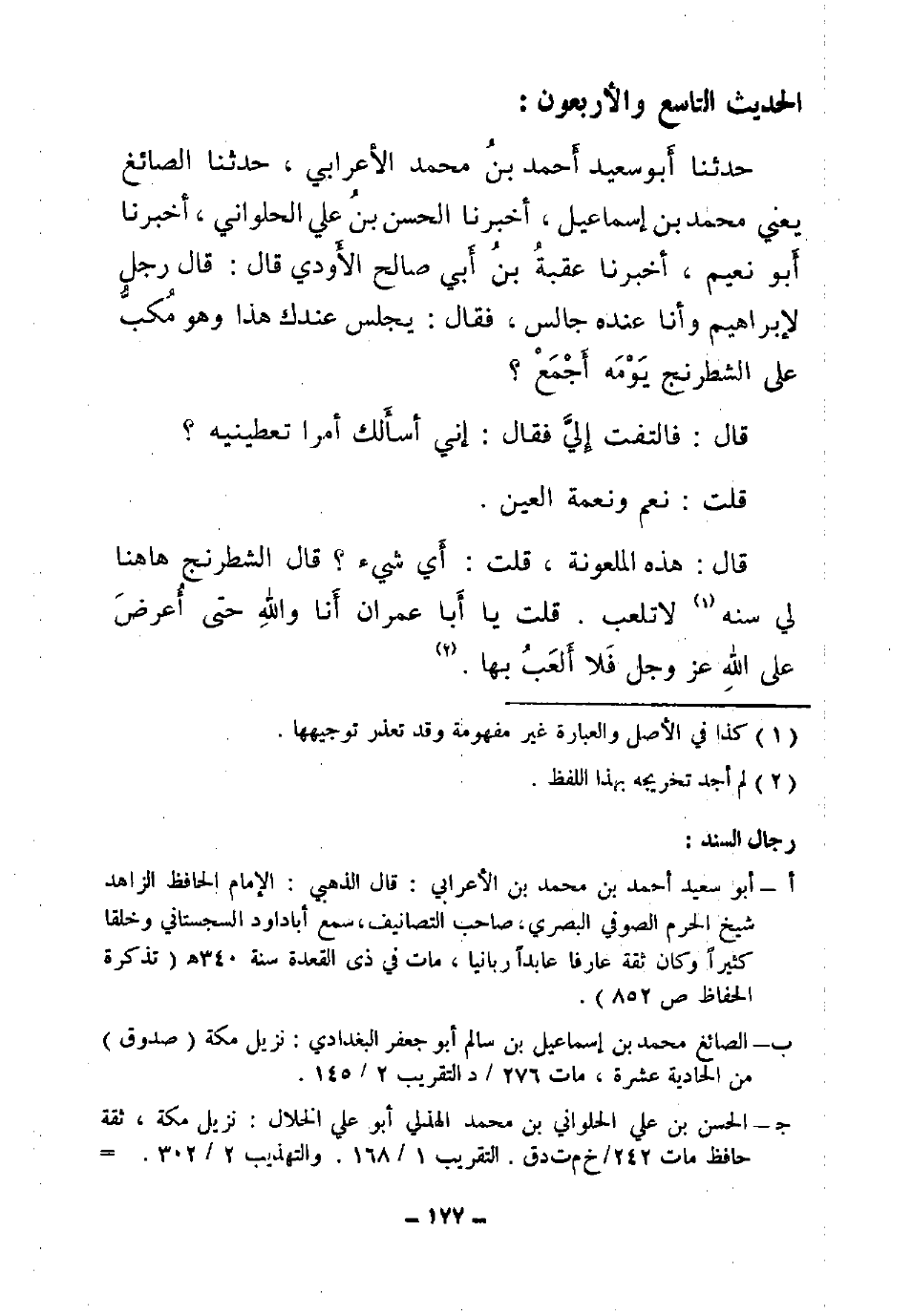 50 - حَدَّثَنَا أَبُو سَعِيدٍ أَحْمَدُ بْنُ مُحَمَّدٍ الْأَعْرَابِيُّ , حَدَّثَنَا الصَّائِغُ , يَعْنِي مُحَمَّدَ بْنَ إِسْمَاعِيلَ , أَخْبَرَنَا الْحَسَنُ بْنُ عَلِيٍّ الْحُلْوَانِيُّ , أَخْبَرَنَا أَبُو نُعَيْمٍ , أَخْبَرَنَا عُقْبَةُ بْنُ أَبِي صَالِحٍ الْأَوْدِيُّ , قَالَ: قَالَ رَجُلٌ لِإِبْرَاهِيمَ وَأَنَا عِنْدَهُ , جَالِسٌ , فَقَالَ: " §يَجْلِسُ عِنْدَكَ هَذَا وَهُوَ مُكِبٌّ عَلَى الشِّطْرَنْجِ يَوْمَهُ أَجْمَعَ؟ . قَالَ: فَالْتَفَتَ إِلَيَّ , فَقَالَ: إِنَّى أَسْأَلُكَ أَمْرًا , تُعْطِينِيهِ؟ . قُلْتُ نَعَمْ وَنِعْمَةُ الْعَيْنِ. قَالَ: هَذِهِ الْمَلْعُونَةُ , قُلْتُ: أَيُّ شَيْءٍ؟ قَالَ: الشِّطْرَنْجُ هَبْهَا لِي سَنَةً. لَا تَلْعَبْ بِهَا. قُلْتُ: يَا أَبَا عِمْرَانَ , أَمَا وَاللَّهِ حَتَّى أُعْرَضَ عَلَى اللَّهِ عَزَّ وَجَلَّ فَلَا أَلْعَبُ بِهَا ".