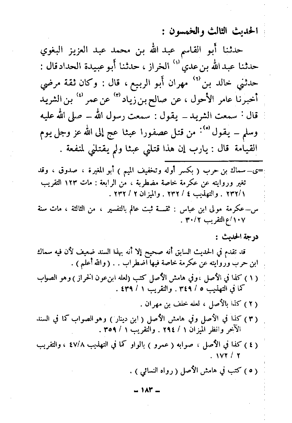54 - حَدَّثَنَا أَبُو الْقَاسِمِ عَبْدُ اللَّهِ بْنُ مُحَمَّدِ بْنِ عَبْدِ الْعَزِيزِ الْبَغَوَيُّ , حَدَّثَنَا عَبْدُ اللَّهِ بْنُ عَدِيٍّ الْخَرَّازُ , حَدَّثَنَا أَبُو عُبَيْدَةَ الْحَدَّادُ , قَالَ: حَدَّثَنِي خَالِدُ بْنُ مِهْرَانَ أَبُو الرَّبِيعِ الْعَدَوِيُّ , قَالَ: وَكَانَ ثِقَةً مَرْضِيًّا , أَخْبَرَنَا عَامِرٌ الْأَحْوَلُ , عَنْ صَالِحِ بْنِ دِينَارٍ , عَنْ عُمَرَ بْنِ الشَّرِيدِ , قَالَ: سَمِعْتُ الشَّرِيدَ , يَقُولُ: سَمِعْتُ رَسُولَ اللَّهِ صَلَّى اللَّهَ عَلَيْهِ وَسَلَّمَ يَقُولُ: " §مَنْ قَتَلَ عُصْفُورًا عَبَثًا عَجَّ إِلَى اللَّهِ عَزَّ وَجَلَّ يَوْمَ الْقِيَامَةِ , قَالَ: يَا رَبِّ إِنَّ هَذَا قَتَلَنِي عَبَثًا وَلَمْ يَقْتُلْنِي لِمَنْفَعَةٍ ".