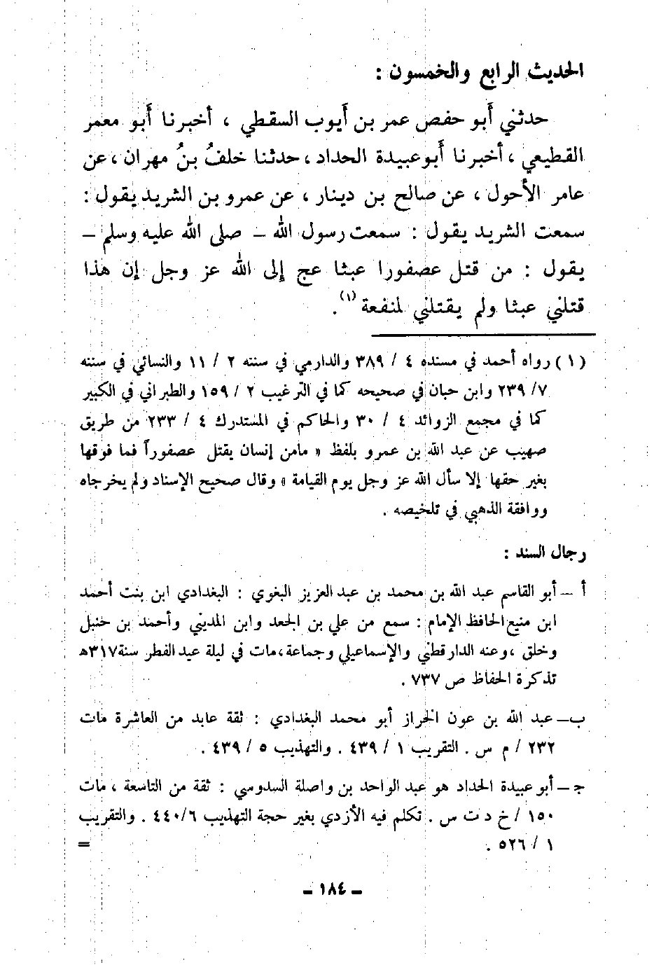 55 - حَدَّثَنِي أَبُو حَفْصٍ عُمَرُ بْنُ أَيُّوبَ السَّقَطِيُّ , أَخْبَرَنَا أَبُو مَعْمَرٍ الْقَطِيعِيُّ , أَخْبَرَنَا أَبُو عُبَيْدَةَ الْحَدَّادُ , حَدَّثَنَا خَلَفُ بْنُ مِهْرَانَ , عَنْ عَامِرٍ الْأَحْوَلُ , عَنْ صَالِحِ بْنِ زِيَادٍ , عَنْ عَمْرِو بْنِ الشَّرِيدِ , قَالَ: سَمِعْتُ الشَّرِيدَ , يَقُولُ: سَمِعْتُ رَسُولَ اللَّهِ صَلَّى اللَّهُ عَلَيْهِ وَسَلَّمَ , يَقُولُ: «§مَنْ قَتَلَ عُصْفُورًا عَبَثًا عَجَّ إِلَى اللَّهِ عَزَّ وَجَلَّ إِنَّ هَذَا قَتَلَنِي عَبَثًا وَلَمْ يَقْتُلْنِي لِمَنْفَعَةٍ» .