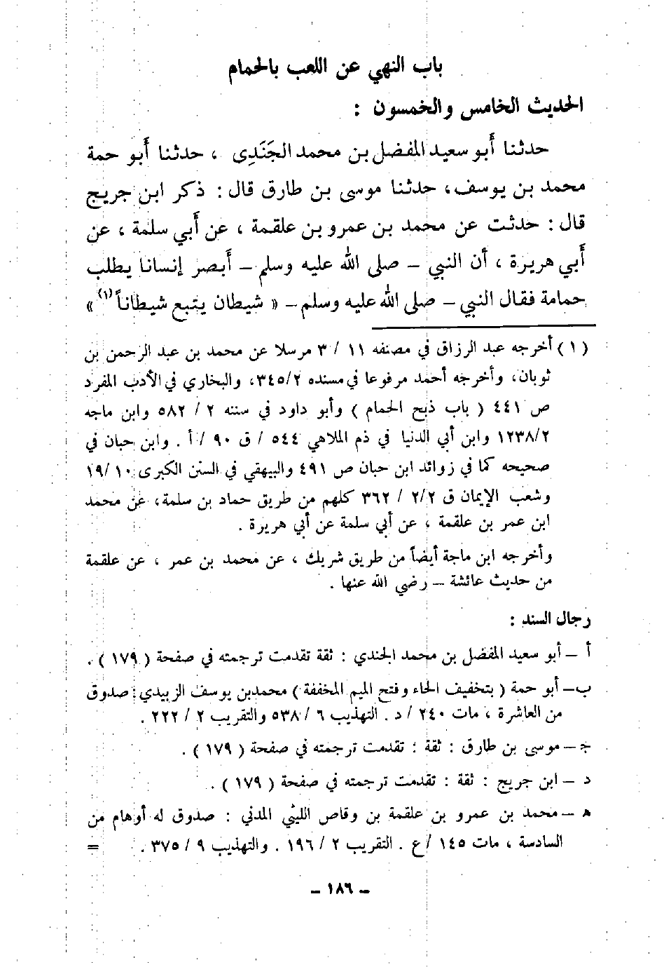 56 - حَدَّثَنَا أَبُو سَعِيدٍ الْمُفَضَّلُ بْنُ مُحَمَّدٍ الْجَنَدِيُّ , حَدَّثَنَا أَبُو حُمَةَ مُحَمَّدُ بْنُ يُوسُفَ , حَدَّثَنَا مُوسَى بْنُ طَارِقٍ , قَالَ: ذَكَرَ ابْنُ جُرَيْجٍ قَالَ: حُدِّثْتُ عَنْ مُحَمَّدِ بْنِ عَمْرِو بْنِ عَلْقَمَةَ , عَنْ أَبِي سَلَمَةَ , عَنْ أَبِي هُرَيْرَةَ , أَنَّ النَّبِيَّ صَلَّى اللَّهُ عَلَيْهِ وَسَلَّمَ أَبْصَرَ إِنْسَانًا يَطْلُبُ حَمَامَةً , فَقَالَ النَّبِيُّ صَلَّى اللَّهُ عَلَيْهِ وَسَلَّمَ: «§شَيْطَانٌ يَتْبَعُ شَيْطَانًا» .