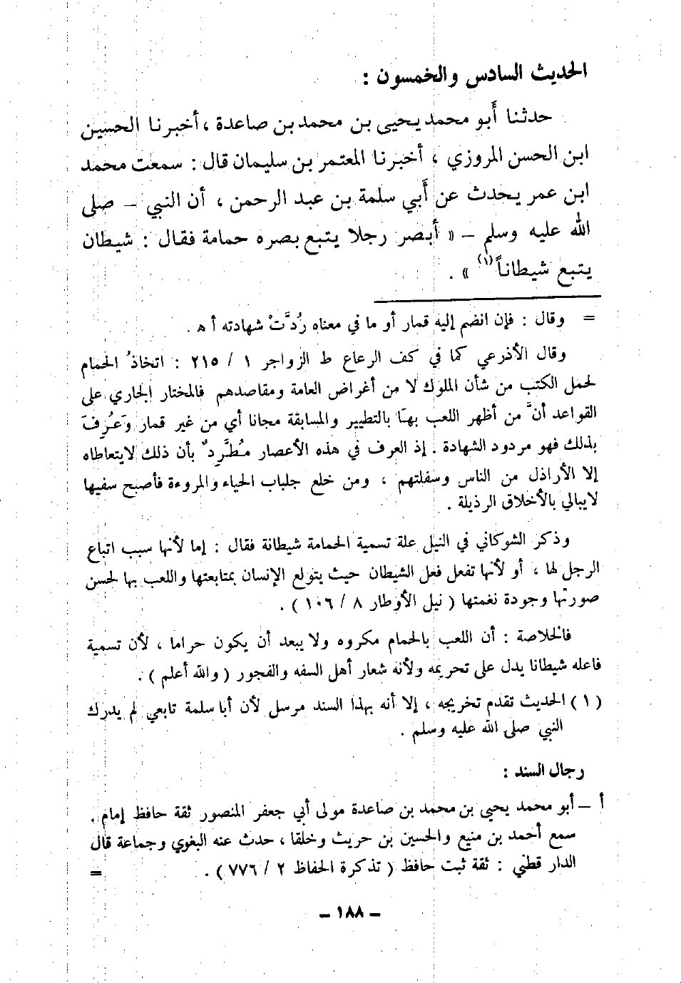 57 - قَالَ حَدَّثَنَا أَبُو مُحَمَّدٍ يَحْيَى بْنُ مُحَمَّدِ بْنِ صَاعِدٍ , أَخْبَرَنَا الْحُسَيْنُ بْنُ الْحَسَنِ الْمَرْوَزِيُّ , أَخْبَرَنَا الْمُعْتَمِرُ بْنُ سُلَيْمَانَ قَالَ سَمِعْتُ مُحَمَّدَ بْنَ عَمْرٍو , يُحَدِّثُ عَنْ أَبِي سَلَمَةَ بْنِ عَبْدِ الرَّحْمَنِ: أَنَّ النَّبِيَّ , صَلَّى اللَّهُ عَلَيْهِ وَسَلَّمَ أَبْصَرَ رَجُلًا يَتْبَعُ بَصَرُهُ حَمَامَةً فَقَالَ: «§شَيْطَانٌ يَتْبَعُ شَيْطَانًا» .
