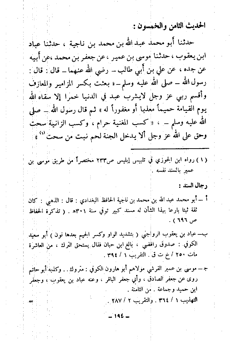 59 - حَدَّثَنَا أَبُو مُحَمَّدٍ عَبْدُ اللَّهِ بْنُ مُحَمَّدِ بْنِ نَاجِيَةَ , حَدَّثَنَا عَبَّادُ بْنُ يَعْقُوبَ , حَدَّثَنَا مُوسَى بْنُ عُمَيْرِ عَنْ جَعْفَرِ بْنِ مُحَمَّدٍ , عَنْ أَبِيهِ , عَنْ جَدِّهِ , عَنْ عَلِيِّ بْنِ أَبِي طَالِبٍ , رَضِيَ اللَّهُ عَنْهُمَا قَالَ: قَالَ رَسُولُ اللَّهِ صَلَّى اللَّهُ عَلَيْهِ وَسَلَّمَ: «§بُعِثْتُ بِكَسْرِ الْمَزَامِيرِ وَالْمَعَازِفِ , وَأَقْسَمَ رَبِّي عَزَّ وَجَلَّ , لَا يَشْرَبُ عَبْدٌ فِي الدُّنْيَا خَمْرًا إِلَّا سَقَاهُ اللَّهُ يَوْمَ الْقِيَامَةِ حَمِيمًا مُعَذَّبًا أَوْ مَغْفُورًا لَهُ» ثُمَّ قَالَ رَسُولُ اللَّهِ صَلَّى اللَّهُ عَلَيْهِ وَسَلَّمَ كَسْبُ الْمُغَنِّيَةِ وَالْمُغَنِّي حَرَامٌ وَكَسْبُ الزَّانِيَةِ سُحْتٌ وَحَقٌّ عَلَى اللَّهِ عَزَّ وَجَلَّ أَلَّا يَدْخُلَ الْجَنَّةَ لَحْمٌ نَبَتَ مِنْ سُحْتٍ "