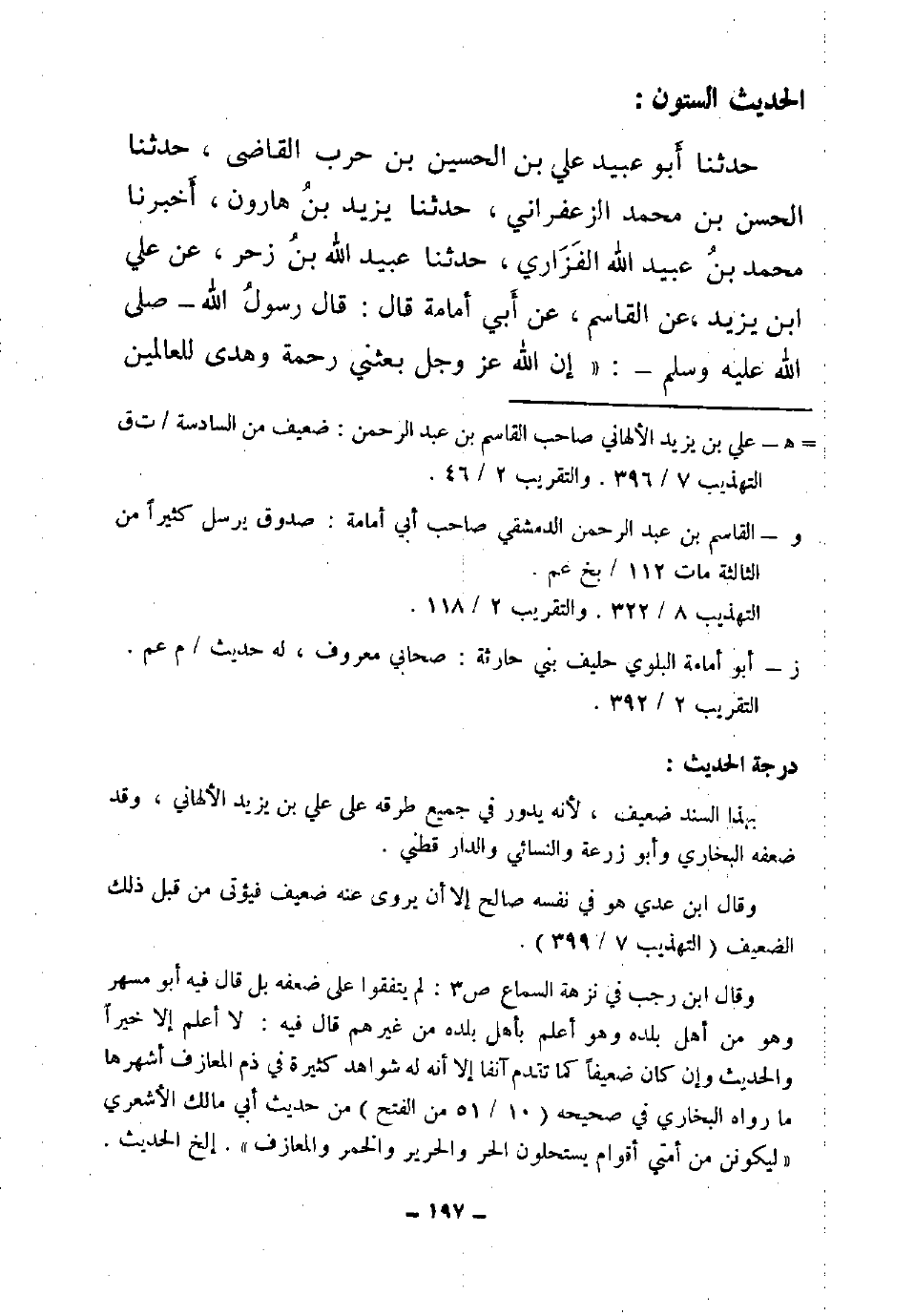 61 - حَدَّثَنَا أَبُو عُبَيْدٍ عَلِيُّ بْنُ الْحُسَيْنِ بْنِ حَرْبٍ الْقَاضِي , حَدَّثَنَا الْحَسَنُ بْنُ مُحَمَّدٍ الزَّعْفَرَانِيُّ , حَدَّثَنَا يَزِيدُ بْنُ هَارُونَ , أَنْبَأَنَا مُحَمَّدُ بْنُ عُبَيْدِ اللَّهِ الْفَزَارِيُّ , حَدَّثَنَا عُبَيْدُ اللَّهِ بْنُ زَحْرٍ , عَنْ عَلِيِّ بْنِ يَزِيدَ , عَنِ الْقَاسِمِ , عَنْ أَبِي أُمَامَةَ , قَالَ: قَالَ رَسُولُ للَّهِ صَلَّى اللَّهُ عَلَيْهِ وَسَلَّمَ: «§إِنَّ اللَّهَ عَزَّ وَجَلَّ بَعَثَنِي رَحْمَةً وَهُدًى لِلْعَالَمِينَ -[198]- وَأَمَرَنِي أَنْ أَمْحَقَ الْمَعَازِفَ وَالْخُمُورَ وَالْأَوْثَانَ الَّتِي كَانَتْ تُعْبَدُ فِي الْجَاهِلِيَّةِ» وَذَكَرَ الْحَدِيثَ