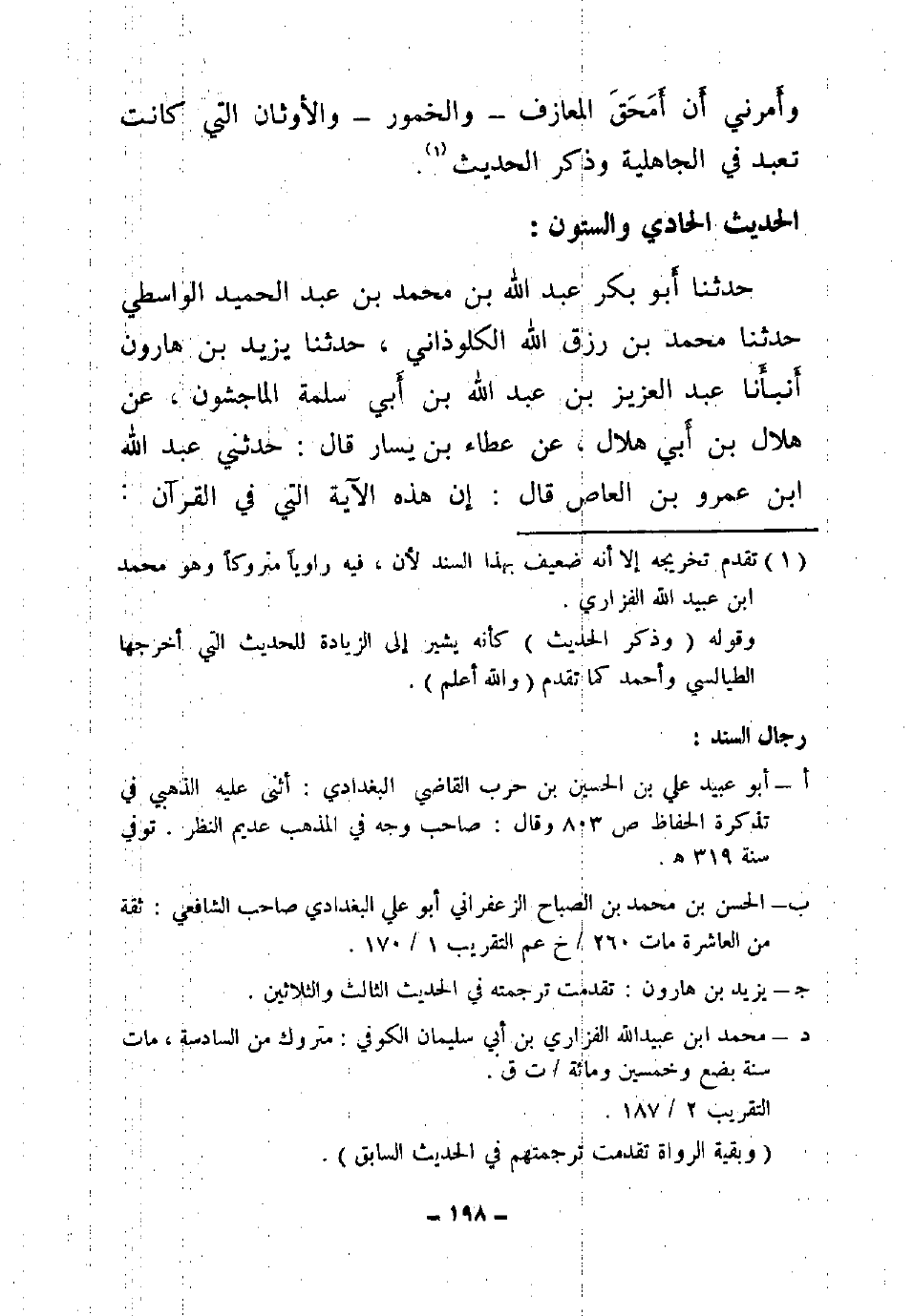 62 - حَدَّثَنَا أَبُو بَكْرٍ عَبْدِ اللَّهِ بْنُ مُحَمَّدِ بْنِ عَبْدِ الْحَمِيدِ الْوَاسِطِيُّ , حَدَّثَنَا مُحَمَّدُ بْنُ رِزْقِ اللَّهِ الْكَلْوَذَانِيُّ , حَدَّثَنَا يَزِيدُ بْنُ هَارُونَ , أَنْبَأَنَا عَبْدُ الْعَزِيزِ بْنُ عَبْدِ اللَّهِ بْنِ أَبِي سَلَمَةَ الْمَاجِشُونُ , عَنْ هِلَالِ بْنِ أَبِي هِلَالٍ , عَنْ عَطَاءِ بْنِ يَسَارٍ , قَالَ: حَدَّثَنِي عَبْدُ اللَّهِ بْنِ عَمْرِو بْنِ الْعَاصِ , قَالَ: " إِنَّ هَذِهِ الْآيَةَ الَّتِي فِي الْقُرْآنِ: -[199]- {يَا أَيُّهَا الَّذِينَ آمَنُوا §إِنَّمَا الْخَمْرُ وَالْمَيْسِرُ وَالْأَنْصَابُ وَالْأَزْلَامُ رِجْسٌ مِنْ عَمَلِ الشَّيْطَانِ فَاجْتَنِبُوهُ لَعَلَّكُمْ تُفْلِحُونَ} [المائدة: 90] هِيَ فِي التَّوْرَاةِ: إِنَّ اللَّهَ عَزَّ وَجَلَّ نَزَّلَ الْحَقَّ لِيُذْهِبَ بِالْبَاطِلِ وَيُبْطِلَ بِهِ اللَّعِبَ وَالْمَعَازِفَ وَالْمِزْهَرَ وَالزِّفَنَ وَالزِّمَارَاتِ وَالْكَنَارَاتِ وَالشِّعْرَ وَالْخَمْرَ مُرَّةً لِمَنْ طَعِمَهَا وَأَقْسَمَ رَبِّي تَبَارَكَ وَتَعَالَى بِيَمِيِنِهِ وَشِدَّةِ حَيْلِهِ لَا يَشْرَبُهَا عَبْدٌ بَعْدَمَا حَرَّمْتُهَا عَلَيْهِ إِلَّا عَطَّشْتُهُ يَوْمَ الْقِيَامَةِ وَلَا يَدَعُهَا عَبْدٌ مِنْ عَبِيدِي بَعْدَمَا حَرَّمْتُهَا عَلَيْهِ إِلَّا سَقَيْتُهُ إِيَّاهَا مِنْ حَظِيرَةِ الْقُدُسِ ".