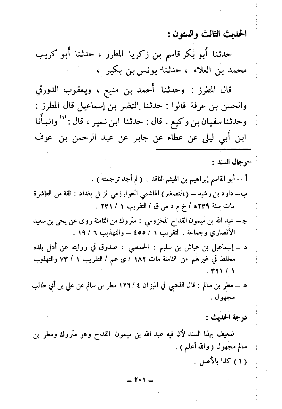 64 - حَدَّثَنَا أَبُو بَكْرٍ قَاسِمُ بْنُ زَكَرِيَّا الْمُطَرِّزُ حَدَّثَنَا أَبُو كُرَيْبٍ مُحَمَّدُ بْنُ الْعَلَاءِ , حَدَّثَنَا يُونُسُ بْنُ بُكَيْرٍ , قَالَ الْمُطَرِّزُ: وَحَدَّثَنَا أَحْمَدُ بْنُ مَنِيعٍ , وَيَعْقُوبُ الدَّوْرَقِيُّ , وَالْحَسَنُ بْنُ عَرَفَةَ , قَالُوا: حَدَّثَنَا النَّضْرُ بْنُ إِسْمَاعِيلَ , قَالَ الْمُطَرِّزُ: وَحَدَّثَنَا سُفْيَانُ بْنُ وَكِيعٍ , قَالَ: أَنْبَأنَا ابْنُ نُمَيْرٍ , قَالَ: وَأَنْبَأَنَا ابْنُ أَبِي لَيْلَى , عَنْ عَطَاءٍ عَنْ جَابِرٍ , عَنْ عَبْدِ الرَّحْمَنِ بْنِ عَوْفٍ , -[202]- رَضِيَ اللَّهُ عَنْهُ قَالَ: أَخَذَ رَسُولُ اللَّهِ صَلَّى اللَّهُ عَلَيْهِ وَسَلَّمَ بِيَدِي فَانْطَلَقَ بِي إِلَى النَّخْلِ فَإِذَا ابْنُهُ إِبْرَاهِيمُ عَلَيْهِ السَّلَامُ يَجُودُ بِنَفْسِهِ , قَالَ: فَأَخَذَهُ فَوَضَعَهُ فِي حِجْرِهِ فَذَرَفَتْ عَيْنَاهُ , ثُمَّ قَالَ: «يَا بُنَيَّ , مَا أَمْلِكُ لَكَ مِنَ اللَّهِ شَيْئًا» , ثُمَّ بَكَى , فَقُلْتُ: يَا رَسُولَ اللَّهِ أَتَبْكِي أَوَلَمْ تُنْهَ عَنِ الْبُكَاءِ؟ قَالَ: «إِنَّمَا §نُهِيتُ عَنِ النَّوْحِ. عَنْ صَوْتَيْنِ أَحْمَقَيْنِ فَاجِرَيْنِ , صَوْتٌ عِنْدَ نَغْمَةِ لَهْوٍ وَلَعِبِ مَزَامِيرِ الشَّيْطَانِ , وَصَوْتٌ عِنْدَ مُصِيبَةٍ خَمْشُ وُجُوهٍ وَشَقُّ جُيُوبٍ وَرَنَّةُ شَيْطَانَ , وَهَذِهِ رَحْمَةٌ مَنْ لَا يَرْحَمْ لَا يُرْحَمُ , يَا إِبْرَاهِيمُ , لَوْلَا أَنَّهُ أَمْرٌ حَقٌّ , وَوَعْدٌ صِدْقٌ , وَأَنَّهَا سَبِيلٌ مَأْتِيَّةٌ لَابُدَّ مِنْهَا حَتَّى يَلْحَقَ آخِرُنَا بِأَوَّلِنَا لَحَزِنَّا عَلَيْكَ حُزْنًا هُوَ أَشَدُّ مِنْ هَذَا وَإِنَّا بِكَ لَمَحْزُونُونَ تَبْكِي الْعَيْنُ وَيُحْرَقُ الْقَلْبُ وَلَا نَقُولُ مَا يُسْخِطُ الرَّبَّ عَزَّ وَجَلَّ» .