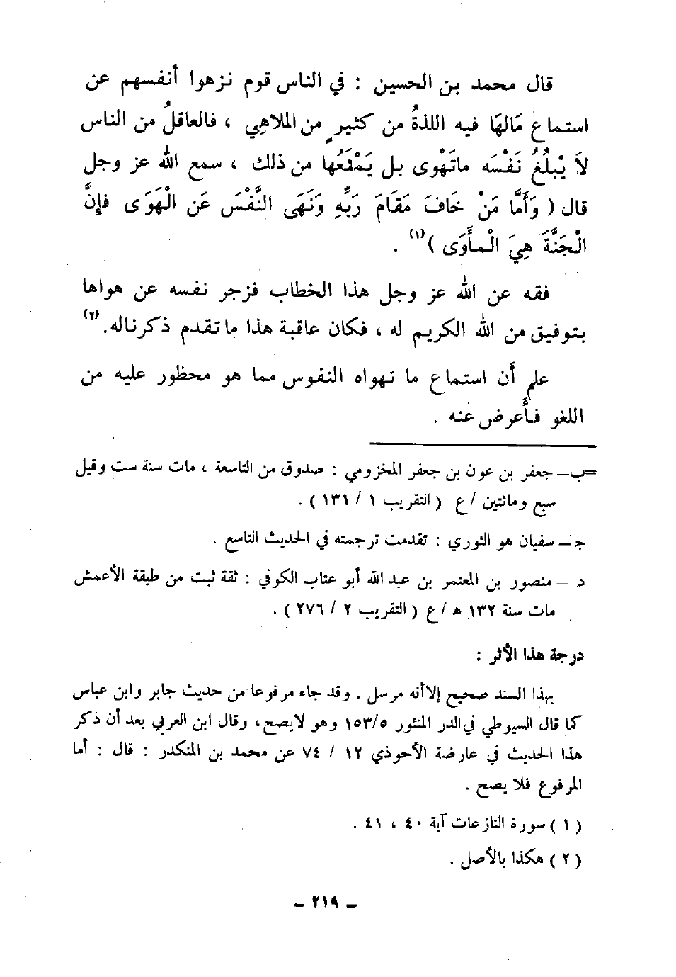 69 - حَدَّثَنَا أَبُو حَفْصٍ عُمَرُ بْنُ مُحَمَّدِ بْنِ بَكَّارٍ , حَدَّثَنَا مُحَمَّدُ بْنُ إِسْحَاقَ الصَّغَانِيُّ , حَدَّثَنَا جَعْفَرُ بْنُ عَوْفٍ , حَدَّثَنَا سُفْيَانُ , عَنْ مَنْصُورٍ , عَنْ مُجَاهِدٍ , قَالَ: " §يُنَادِى مُنَادٍ يَوْمَ الْقِيَامَةِ أَيْنَ الَّذِينَ كَانُوا يُنَزِّهُونَ أَنْفُسَهُمْ وَأَسْمَاعَهُمْ عَنِ اللَّهْوِ وَمَزَامِيرِ الشَّيْطَانِ. قَالَ فَيَجْعَلُهُمُ اللَّهُ عَزَّ وَجَلَّ فِي رِيَاضِ الْمِسْكِ ثُمَّ يَقُولُ لِلْمَلَائِكَةِ أَسْمِعُوهُمْ عِبَادِي تَحْمِيدِي وَتَمْجِيدِي وَالثَّنَاءَ عَلَيَّ وَأَخْبِرُوهُمْ أَلَّا خَوْفٌ عَلَيْهِمْ وَلَا هُمْ يَحْزَنُونَ قَالَ مُحَمَّدُ بْنُ الْحُسَيْنِ: فِي النَّاسِ قَوْمٌ نَزَّهُوا أَنْفُسَهُمْ عَنِ اسْتِمَاعِ مَا لَهَا فِيهِ اللَّذَّةُ مِنْ كَثِيرٍ مِنَ الْمَلَاهِي فَالْعَاقِلُ مِنَ النَّاسِ لَا يُبَلِّغُ نَفْسَهُ مَا تَهْوَى بَلْ يَمْنَعُهَا مِنْ ذَلِكَ , سَمِعَ اللَّهَ عَزَّ وَجَلَّ قَالَ: {وَأَمَّا مَنْ خَافَ مَقَامَ رَبِّهِ وَنَهَى النَّفْسَ عَنِ الْهَوَى فَإِنَّ الْجَنَّةَ هِيَ الْمَأْوَى} [النازعات: 41] فَقِهَ عَنِ اللَّهِ عَزَّ وَجَلَّ , هَذَا الْخِطَابَ فَزَجَرَ نَفْسَهُ عَنْ هَوَاهَا بِتَوْفِيقٍ مِنَ اللَّهِ الْكَرِيمِ لَهُ فَكَانَ عَاقِبَةُ هَذَا مَا تَقَدَّمَ ذِكْرُنَا لَهُ. عَلِمَ أَنَّ اسْتِمَاعَ مَا تَهْوَاهُ النُّفُوسُ مِمَّا هُوَ مَحْظُورٌ عَلَيْهِ مِنَ اللَّغْوِ فَأَعْرَضَ عَنْهُ. -[220]- سَمِعَ اللَّهَ عَزَّ وَجَلَّ قَالَ وَقَدْ مَدَحَ الْعُقَلَاءَ فَقَالَ: {وَإِذَا سَمِعُوا اللَّغْوَ أَعْرَضُوا عَنْهُ} [القصص: 55] وَسَمِعَ اللَّهَ عَزَّ وَجَلَّ قَالَ: {وَالَّذِينَ هُمْ عَنِ اللَّغْوِ مُعْرِضُونَ} [المؤمنون: 3] فَمَدَحَهُمْ بِإِعْرَاضِهِمْ عَنِ الْبَاطِلِ فَكَانَ مُرَادُهُ أَنْ يَسْتَمِعَ إِلَى مَا نَدَبَهُ إِلَيْهِ مَوْلَاهُ الْكَرِيمُ مِمَّا سَمِعَهُ أَحَبَّهُ مَوْلَاهُ وَكَانَ لَهُ بِاسْتِمَاعِهِ الرَّحْمَةُ , قَالَ اللَّهُ عَزَّ وَجَلَّ قَالَ: {وَإِذَا قُرِئَ الْقُرْآنُ فَاسْتَمِعُوا لَهُ وَأَنْصِتُوا لَعَلَّكُمْ تُرْحَمُونَ} [الأعراف: 204] وَسَمِعَ اللَّهَ عَزَّ وَجَلَّ قَالَ: {فَبَشِّرْ عِبَادِ الَّذِينَ يَسْتَمِعُونَ الْقَوْلَ فَيَتَّبِعُونَ أَحْسَنَهُ أُولَئِكَ الَّذِينَ هَدَاهُمُ اللَّهُ وَأُولَئِكَ هُمْ أُولُو الْأَلْبَابِ} هَذِهِ صِفَةُ الْعُقَلَاءِ