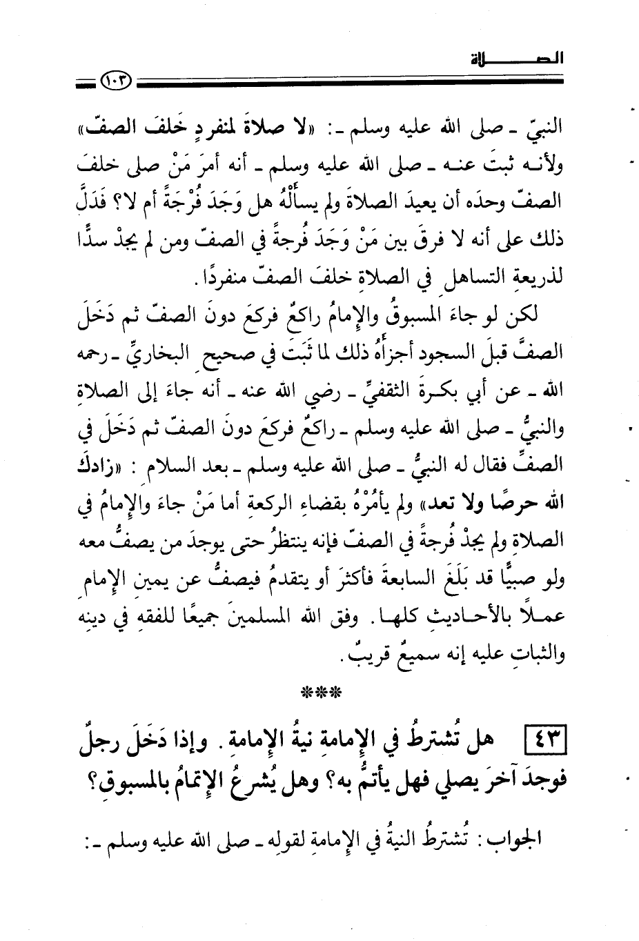 43 - هل تشترط في الإمامة نية الإمامة، وإذا دخل رجل فوجد آخر يصلي فهل يأتم به؟ وهل يشرع الائتمام بالمسبوق؟