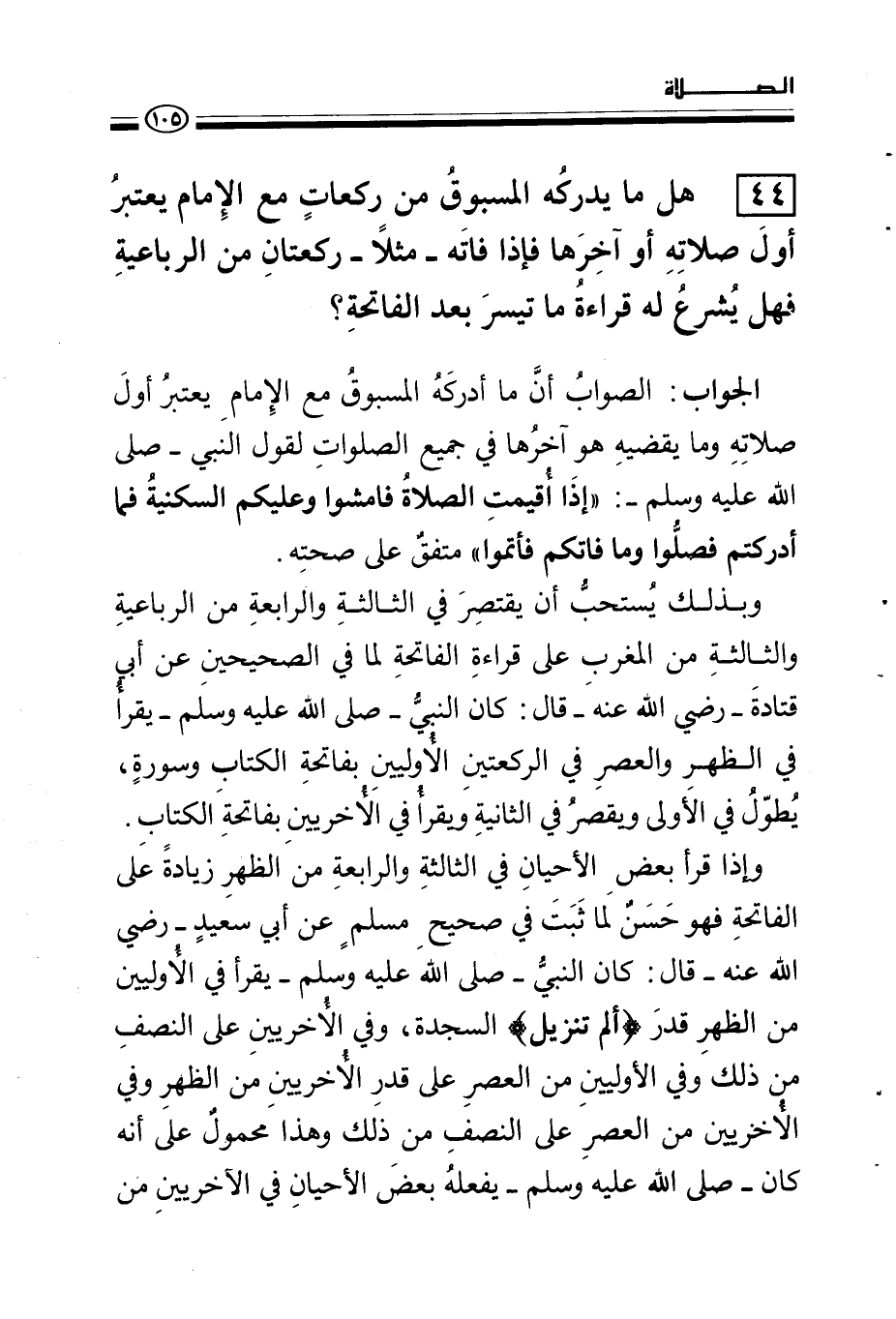 44 - هل ما يدركه المسبوق من ركعات مع الإمام يعتبر أول صلاته أو آخرها فإذا فاته - مثلا - ركعتان من الرباعية هل يشرع له قراءة ما تيسر بعد الفاتحة؟