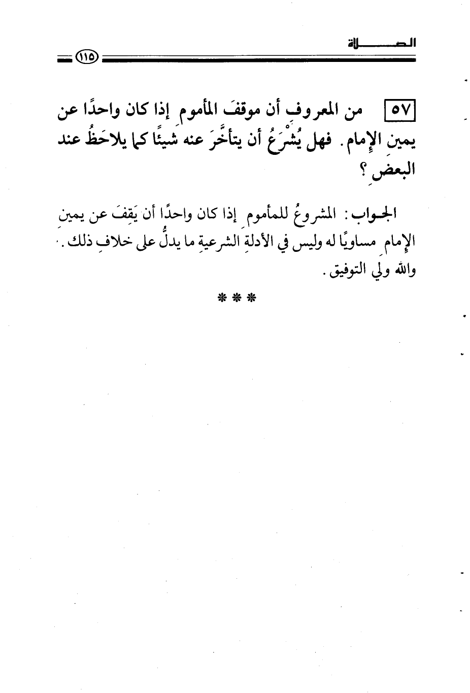 57 - من المعروف أن موقف المأموم إذا كان واحدا عن يمين الإمام، فهل يشرع أن يتأخر عنه شيئا كما يلاحظ عند البعض؟