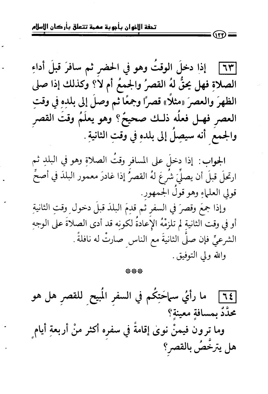 63 - إذا دخل الوقت وهو في الحضر ثم سافر قبل أداء الصلاة فهل يحق له القصر والجمع أم لا؟ وكذلك إذا صلى الظهر والعصر " مثلا " قصرا وجمعا ثم وصل إلى بلده في وقت العصر فهل فعله ذلك صحيح؟ وهو يعلم وقت القصر والجمع أنه سيصل إلى بلده في وقت الثانية.
