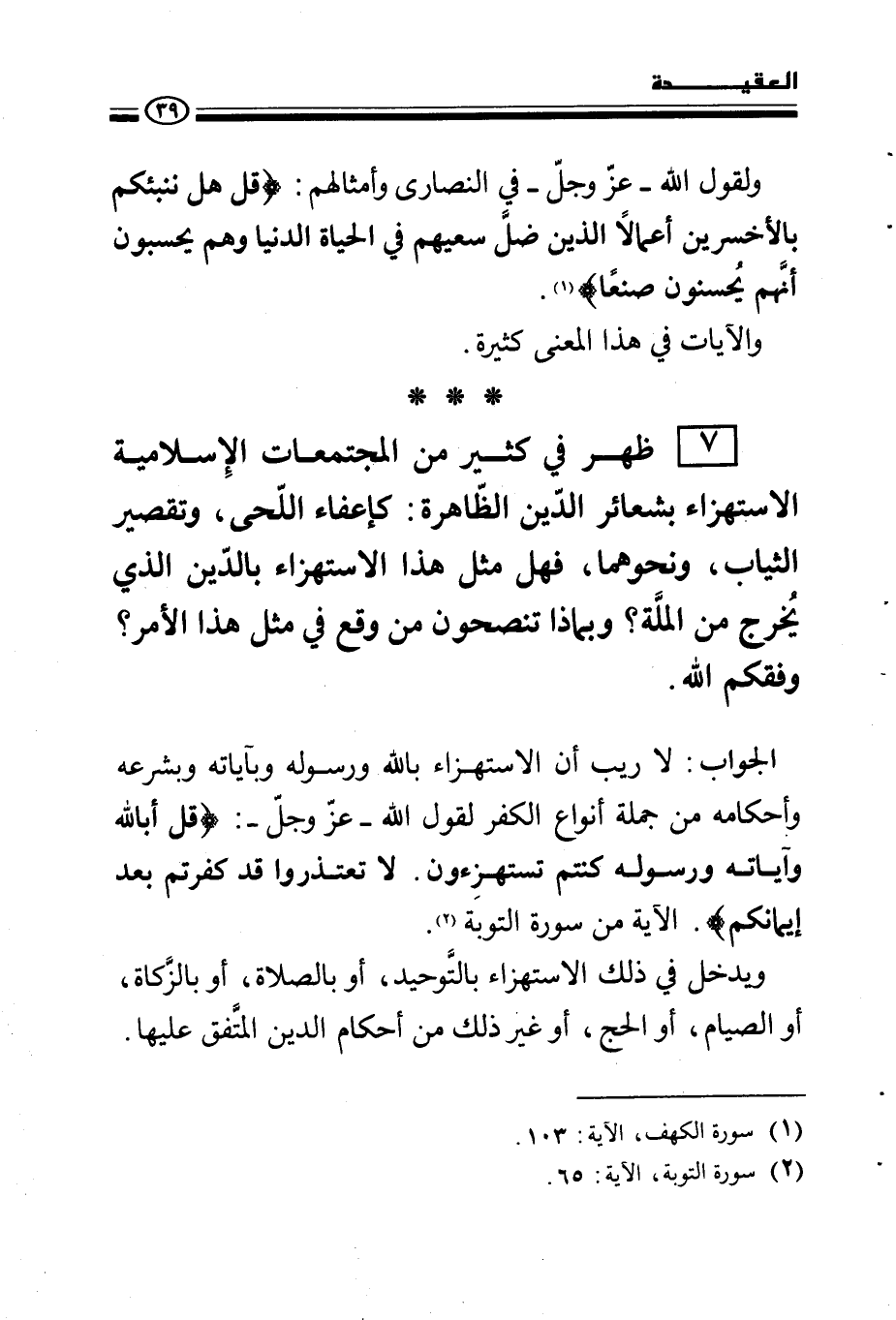 الجواب: لا ريب أن الاستهزاء بالله ورسوله وبآياته وبشرعه وأحكامه من جملة أنواع الكفر لقول الله - عز وجل -: {قُلْ أَبِاللَّهِ وَآيَاتِهِ وَرَسُولِهِ كُنْتُمْ تَسْتَهْزِئُونَ - لَا تَعْتَذِرُوا قَدْ كَفَرْتُمْ بَعْدَ إِيمَانِكُمْ} [التوبة: 65 - 66] الآية من سورة التوبة (¬2) .