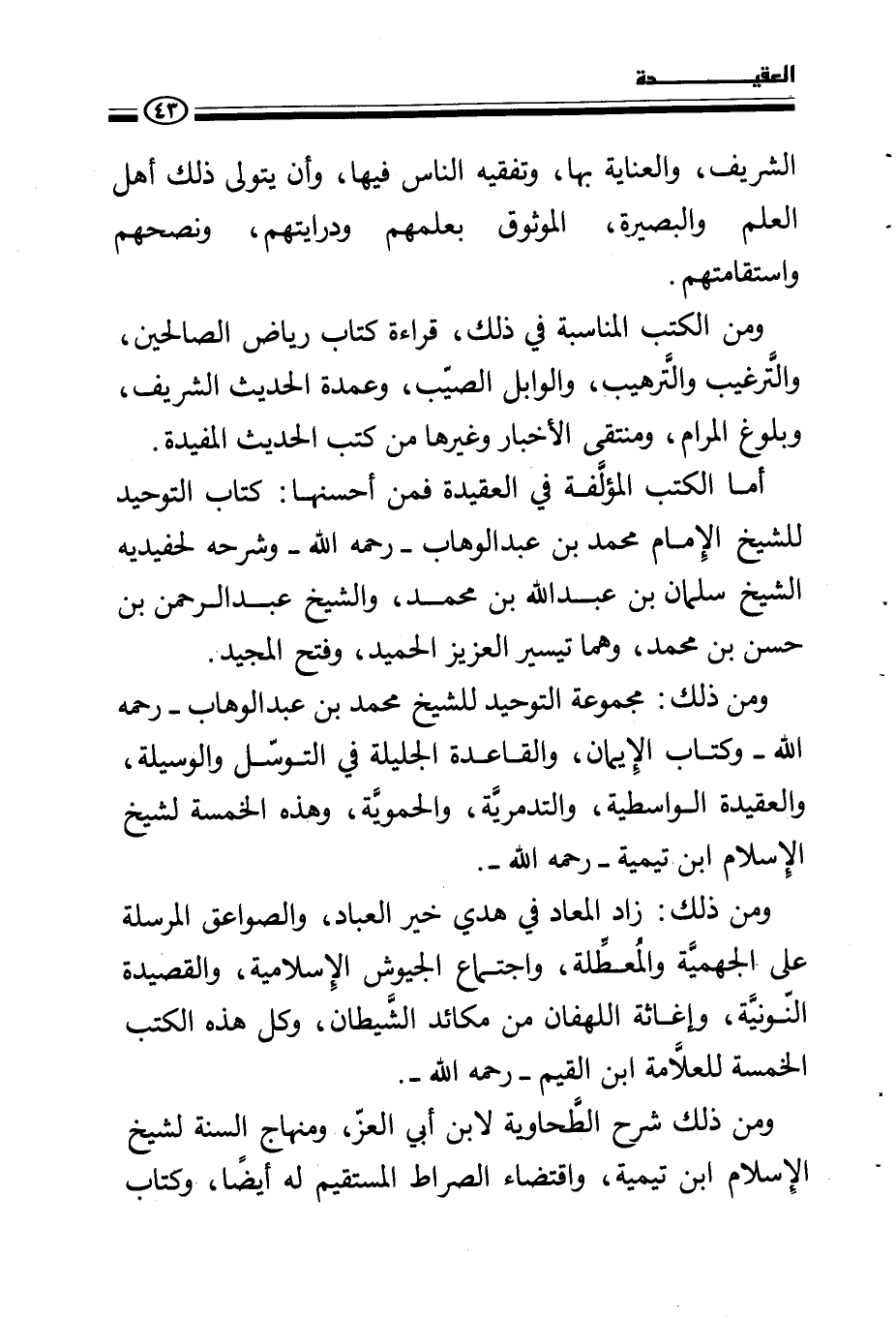 ومن ذلك: مجموعة التوحيد للشيخ محمد بن عبد الوهاب - رحمه الله - وكتاب الإيمان، والقاعدة الجليلة في التوسل والوسيلة، والعقيدة الواسطية، والتدمرية، والحموية، وهذه الخمسة لشيخ الإسلام ابن تيمية - رحمه الله -.