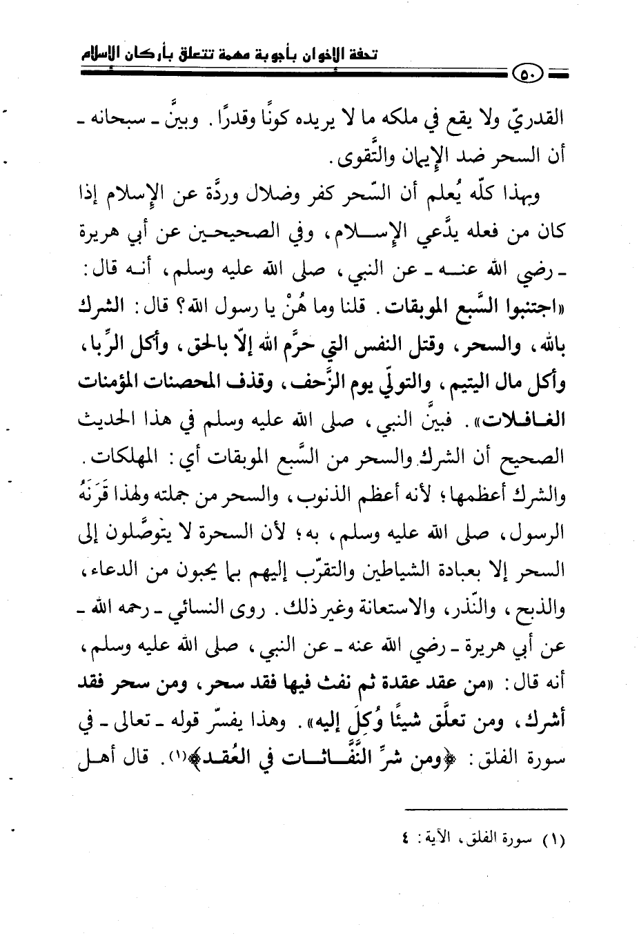 وبهذا كله يعلم أن السحر كفر وضلال وردة عن الإسلام إذا كان من فعله يدعي الإسلام، وفي الصحيحين عن أبي هريرة - رضي الله عنه - عن النبي - صلى الله عليه وسلم - أنه قال: «اجتنبوا السبع الموبقات، قلنا: وما هن يا رسول الله؟ قال: الشرك بالله، والسحر، وقتل النفس التي حرم الله إلا بالحق، وأكل الربا، وأكل مال اليتيم، والتولي يوم الزحف، وقذف المحصنات المؤمنات الغافلات» . فبين النبي - صلى الله عليه وسلم - في هذا الحديث الصحيح أن الشرك والسحر من السبع الموبقات أي: المهلكات، والشرك أعظمها؛ لأنه أعظم الذنوب، والسحر من جملته ولهذا قرنه الرسول - صلى الله عليه وسلم - به؛ لأن السحرة لا يتوسلون إلى السحر إلا بعبادة الشياطين والتقرب إليهم بما يحبون من الدعاء، والذبح، والنذر، والاستعانة وغير ذلك. روى النسائي - رحمه الله - عن أبي هريرة - رضي الله عنه - عن النبي - صلى الله عليه وسلم - أنه قال: «من عقد عقدة ثم نفث فيها فقد سحر، ومن سحر فقد أشرك، ومن تعلق شيئا وكل إليه» . وهذا يفسر قوله - تعالى - في سورة الفلق: {وَمِنْ شَرِّ النَّفَّاثَاتِ فِي الْعُقَدِ} [الفلق: 4] (¬1) قال أهل