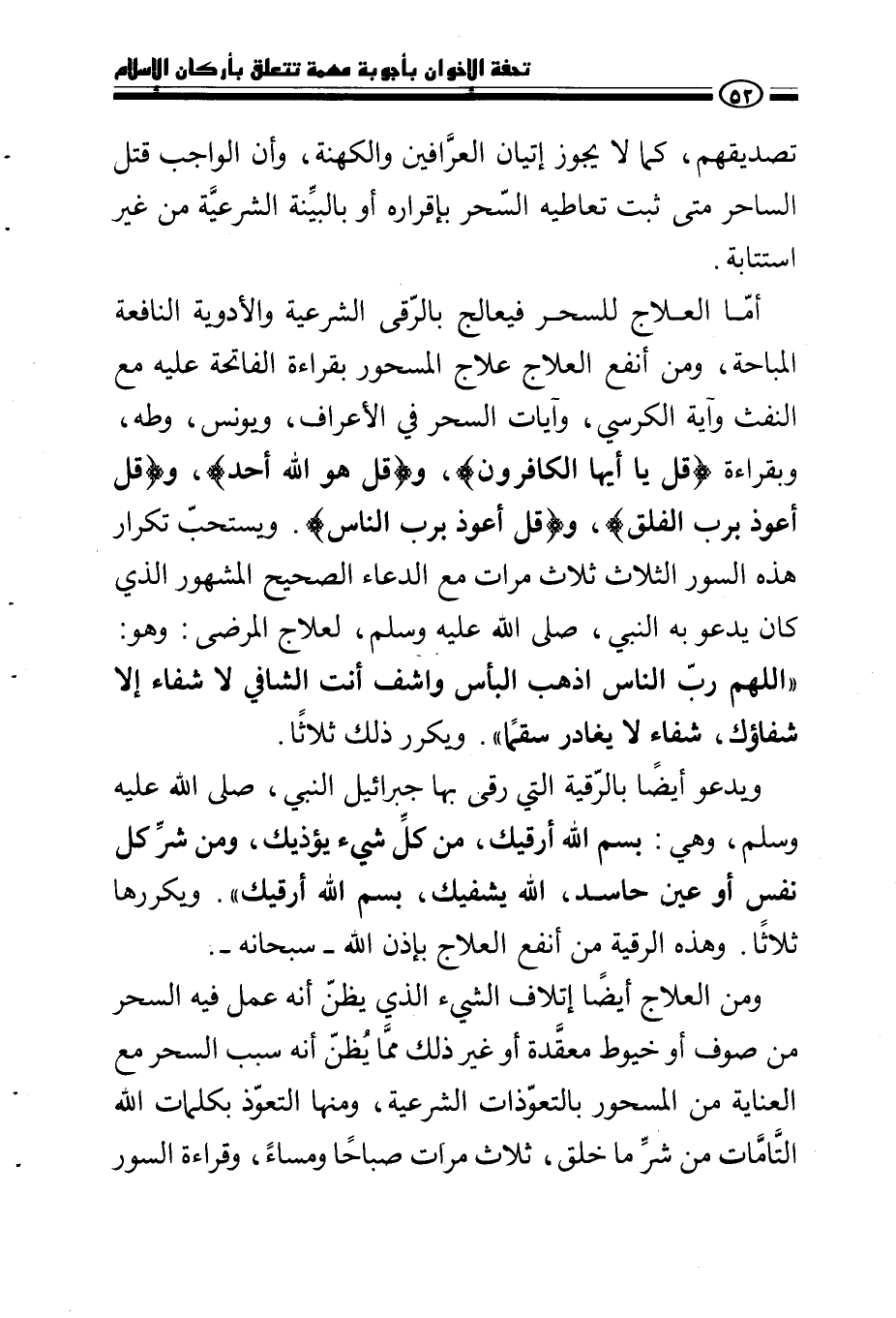 تصديقهم، كما لا يجوز إتيان العرافين والكهنة، وأن الواجب قتل الساحر متى ثبت تعاطيه السحر بإقراره أو بالبينة الشرعية من غير استتابة.