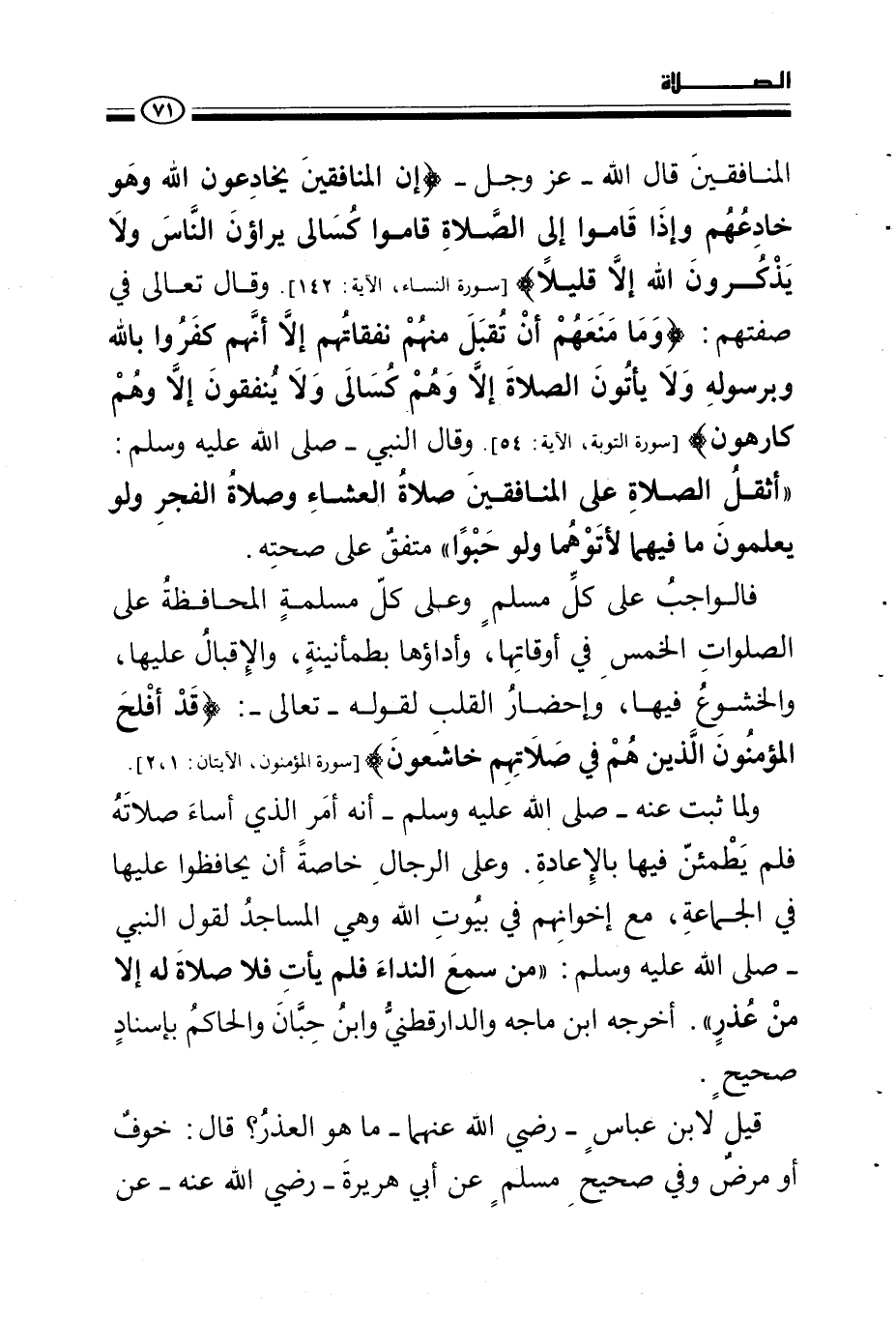 المنافقين قال الله - عز وجل - {إِنَّ الْمُنَافِقِينَ يُخَادِعُونَ اللَّهَ وَهُوَ خَادِعُهُمْ وَإِذَا قَامُوا إِلَى الصَّلَاةِ قَامُوا كُسَالَى يُرَاءُونَ النَّاسَ وَلَا يَذْكُرُونَ اللَّهَ إِلَّا قَلِيلًا} [النساء: 142] وقال تعالى في صفتهم: {وَمَا مَنَعَهُمْ أَنْ تُقْبَلَ مِنْهُمْ نَفَقَاتُهُمْ إِلَّا أَنَّهُمْ كَفَرُوا بِاللَّهِ وَبِرَسُولِهِ وَلَا يَأْتُونَ الصَّلَاةَ إِلَّا وَهُمْ كُسَالَى وَلَا يُنْفِقُونَ إِلَّا وَهُمْ كَارِهُونَ} [التوبة: 54] وقال النبي - صلى الله عليه وسلم -: «أثقل الصلاة على المنافقين صلاة العشاء وصلاة الفجر ولو يعلمون ما فيهما لأتوهما ولو حبوا» متفق على صحته.