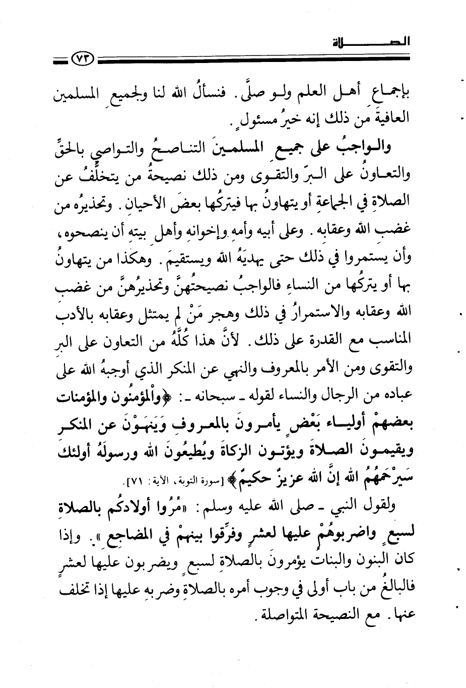 ولقول النبي - صلى الله عليه وسلم -: «مروا أولادكم بالصلاة لسبع واضربوهم عليها لعشر وفرقوا بينهم في المضاجع» . وإذا كان البنون والبنات يؤمرون بالصلاة لسبع ويضربون عليها لعشر فالبالغ من باب أولى في وجوب أمره بالصلاة وضربه عليها إذا تخلف عنها. مع النصيحة المتواصلة.