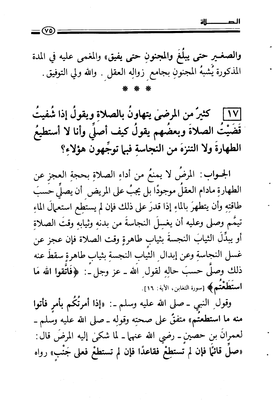 17 - كثير من المرضى يتهاون بالصلاة ويقول إذا شفيت قضيت الصلاة وبعضهم يقول كيف أصلي وأنا لا أستطيع الطهارة ولا التنزه من النجاسة فبما توجهون هؤلاء؟