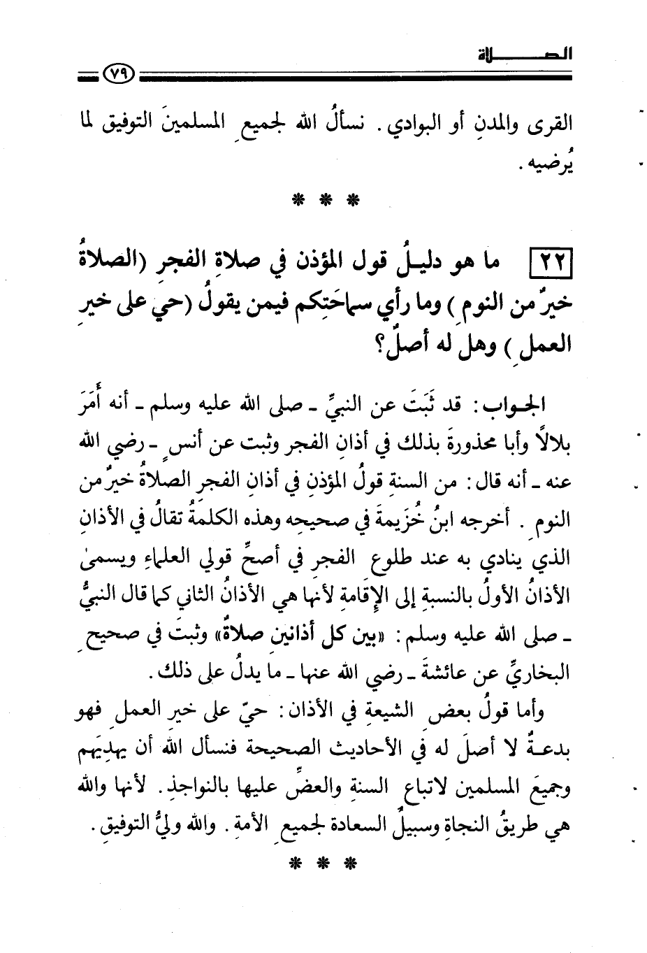 22 - ما هو دليل قول المؤذن في صلاة الفجر (الصلاة خير من النوم) وما رأي سماحتكم فيمن يقول (حي على خير العمل) وهل له أصل؟