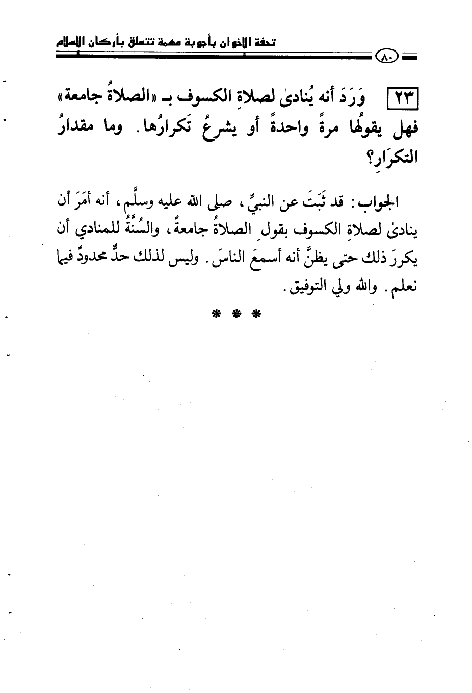 23 - ورد أنه ينادى لصلاة الكسوف ب " الصلاة جامعة" فهل يقولها مرة واحدة أو يشرع تكرارها. وما مقدار التكرار؟